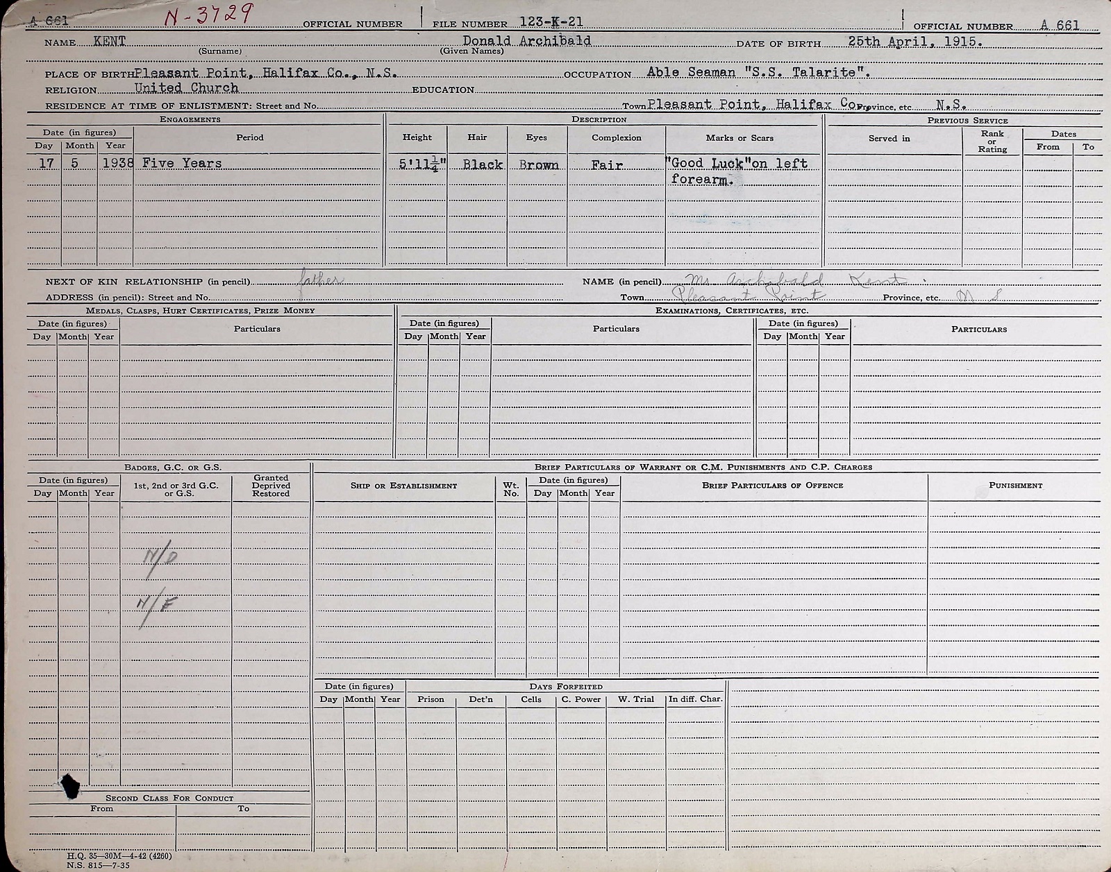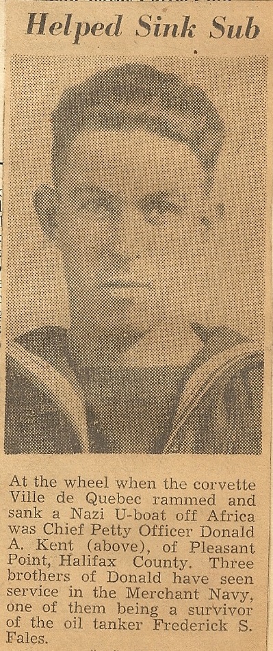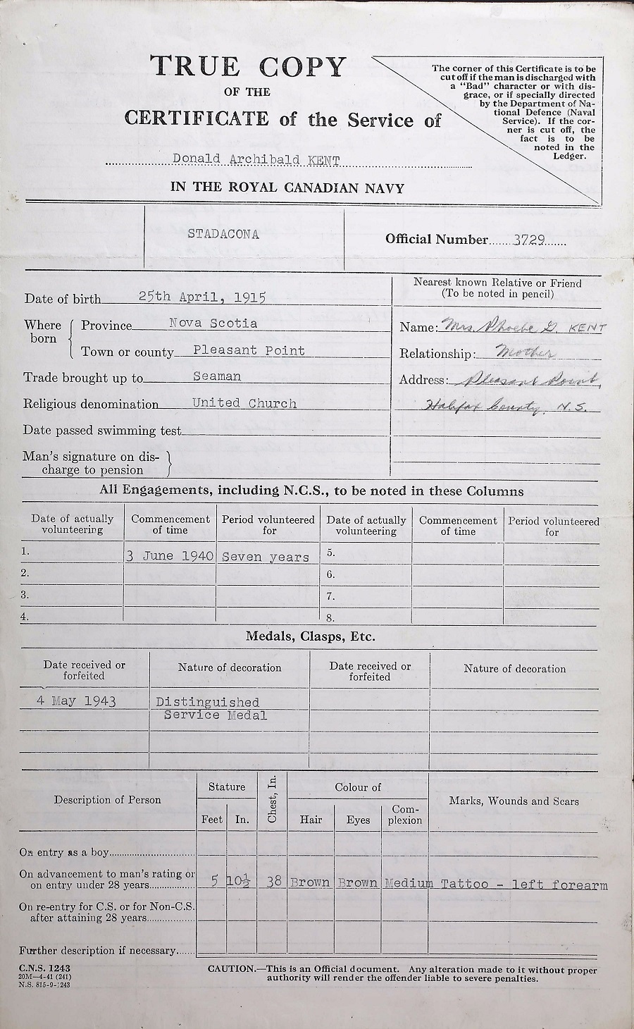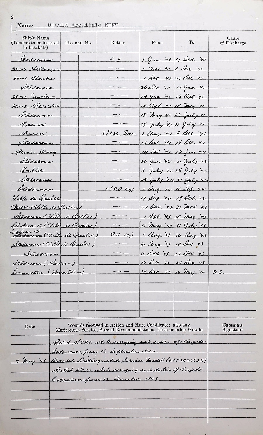 D.S.M. Citation: KENT, Donald Archibald, Acting Chief Petty Officer, 3729, Distinguished Service Medal, RCN, HMCS VILLE DE QUEBEC. Awarded as per London Gazette of 4 May 1943 "For skill and judgement in action against enemy Submarines while serving in H.M. Canadian Ship VILLE DE QUEBEC"