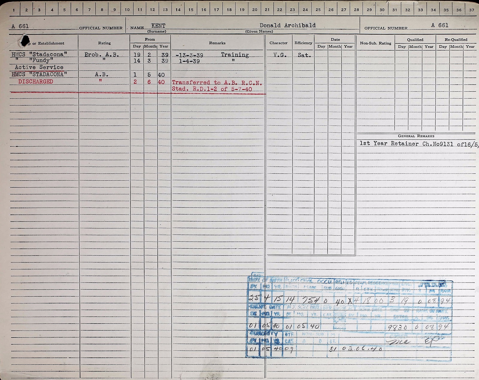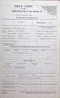 Ships served in: HMCS FUNDY - Served in Fundy 14 Mar 19149 - 01 Apr 1939 for training as a Prob. AB, RCNR DEMS HALLANGER - Served in Hallanger 01 Nov 1940 - 06 Dec 1940 as an AB, RCN DEMS ALASKA - Served in Alaska 07 Dec 1940 - 25 Dec 1940 as an AB, RCN DEMS JANELEW - Served in Janelew 14 Jan 1941 - 18 Apr 1941 as an AB, RCN DEMS RECORDER - Served in Recorder 19 Apr 1941 - 14 May 1941 as an AB, RCN HMCS BEAVER - Served in Beaver 25 Jul 1941 - 09 Dec 1941 as an AB and A/LS, RCN. Rated A/LS 01 Aug 1941 HMCS PRINCE HENRY - Served in Prince Henry 19 Dec 1941 - 19 Jun 1941 as an A/LS, RCN HMCS AMBLER - Served in Ambler 03 Jul 1942 - 28 Jul 1942 as an A/LS, RCN HMCS VILLE DE QUEBEC - Served in Ville de Quebec 17 Sep 1942 - 10 Dec 1943 as an A/PO and PO, RCN. Rated PO 01 Aug 1943. Rated A/CPO 18 Dec 1942 while performing duties of TC. HMS PERSIAN - Served in Persian 19 Dec 1943 - 20 Dec 1943 as a PO, RCN HMCS HAMILTON - Drafted to Hamilton 21 Dec 1943 as a PO, RCN. Rated A/CPO 22 Dec 1943 while performing the Duties of Torpedo Cox'n.