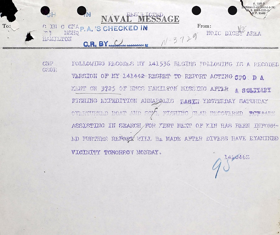 (DK01-DK02) RCNR Service Summary (DK03-DK04) RCN Certificate of Service (DK05) Article on CPO Kent being helsman on HMCS VILLE DE QUEBEC when she rammed U-224 (DK06) Message to HMCS HAMILTON informing the ship that CPO Hamilton was missing after his boat overturned while on a solitary fishing expedition in Annapolis Basin, NS.