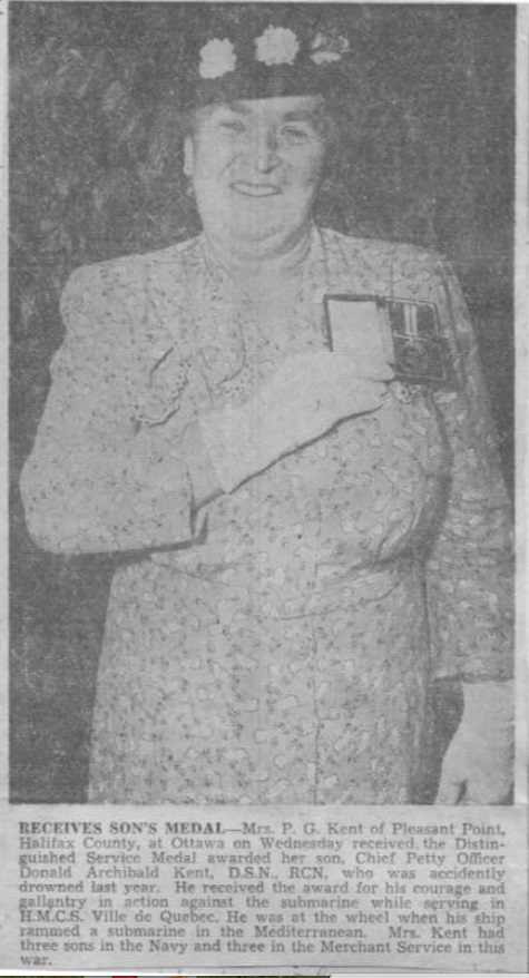 (DK07) Torpedo Cox'n Kent (DK08) Mrs. P.G. Kent receives the DSM on behalf of her son, CPO Donald Kent, who had had died in a fishing accident (DK09) Article on the search for PO Donald Kent