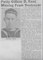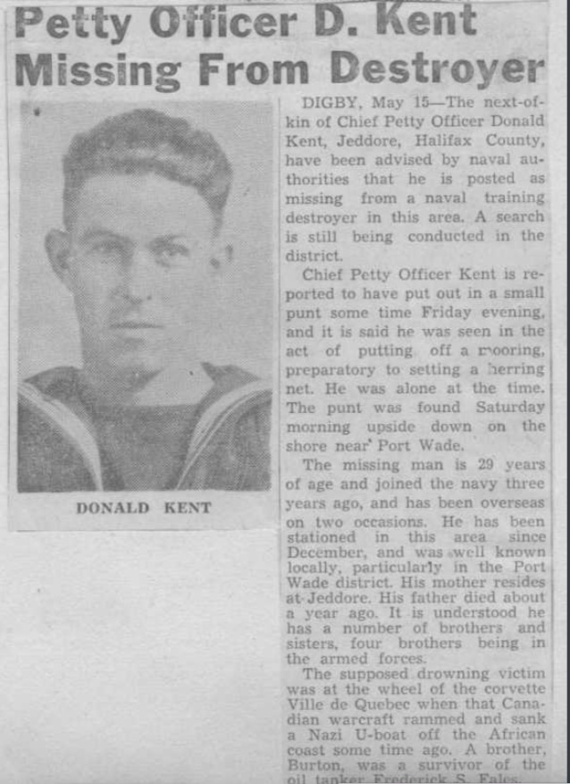KENT, Donald Archibald, CPO, 3729, RCN, died - 12 May 1944, HMCS HAMILTON - son of Archibald and Phoebe Kent, Point Pleasant, NS. Donald unlisted in the RCNR on 19 Feb 1939 as a Prob Able Seaman, A661. On 03 Jun 1940 he transferred to the RCN. Chief Petty Officer Kent was on a week-end leave and drowned on a fishing expedition at Annapolis Basin, Nova Scotia. He was buried in the Pleasant Point Public Cemetery, NS.