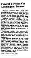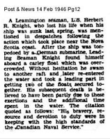 (HK03) Article from the Leamington Post on the funeral for LS Knight - 26 Apr 1945 (HK04) Article from the Leamington Post on Herbert Knight being awarded M.I.D - 14 Feb 1946 (HK05) Article on LS Knight's actions when HMCS ESQUIMALT was sunk - Toronto Star - 10 May 1945 (HK06) Newspaper article on the sinking of HMCS ESQUIMALT by U-190 - LS Knight's actions are mentioned in the article (HK07) Newspaper article U-190's pending demise as a target ship - The Windsor Daily Star 17 Jul 1947