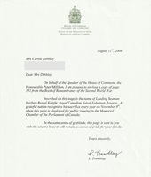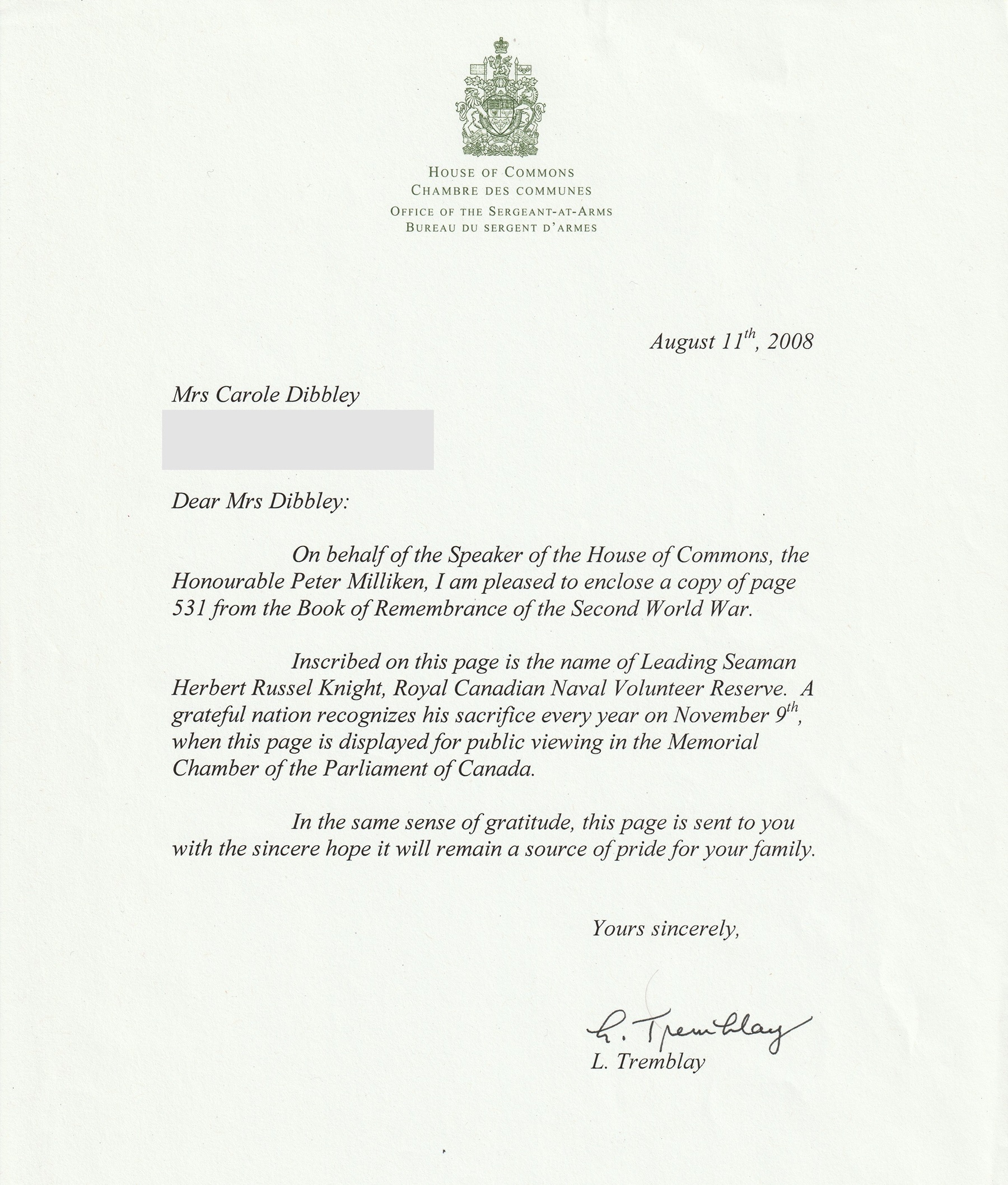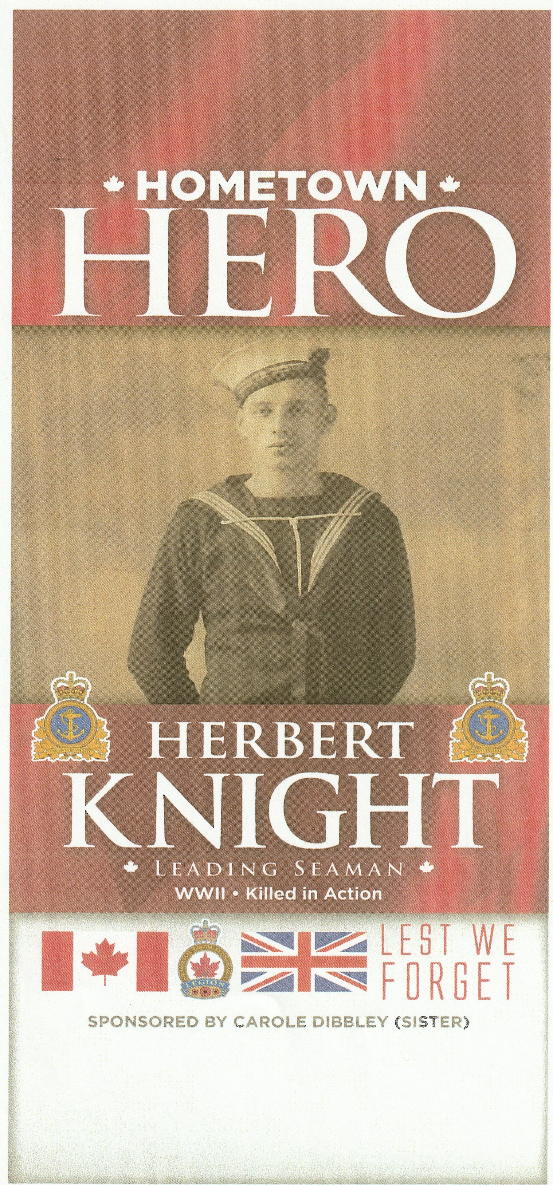 (HK08-HK08) Cover letter and Book of Remembrance entry sent to LS Herbert Knight's sister, Carole Dibbley (HK11) Hometown Hero banner for Herbert Knight that is flown in Leamington, Ontario