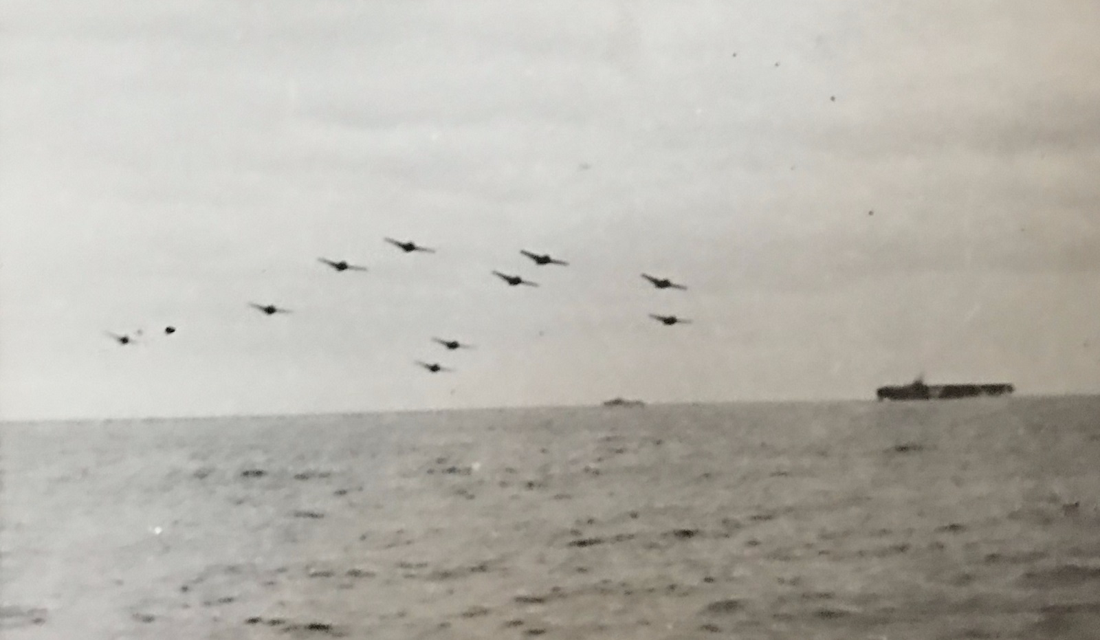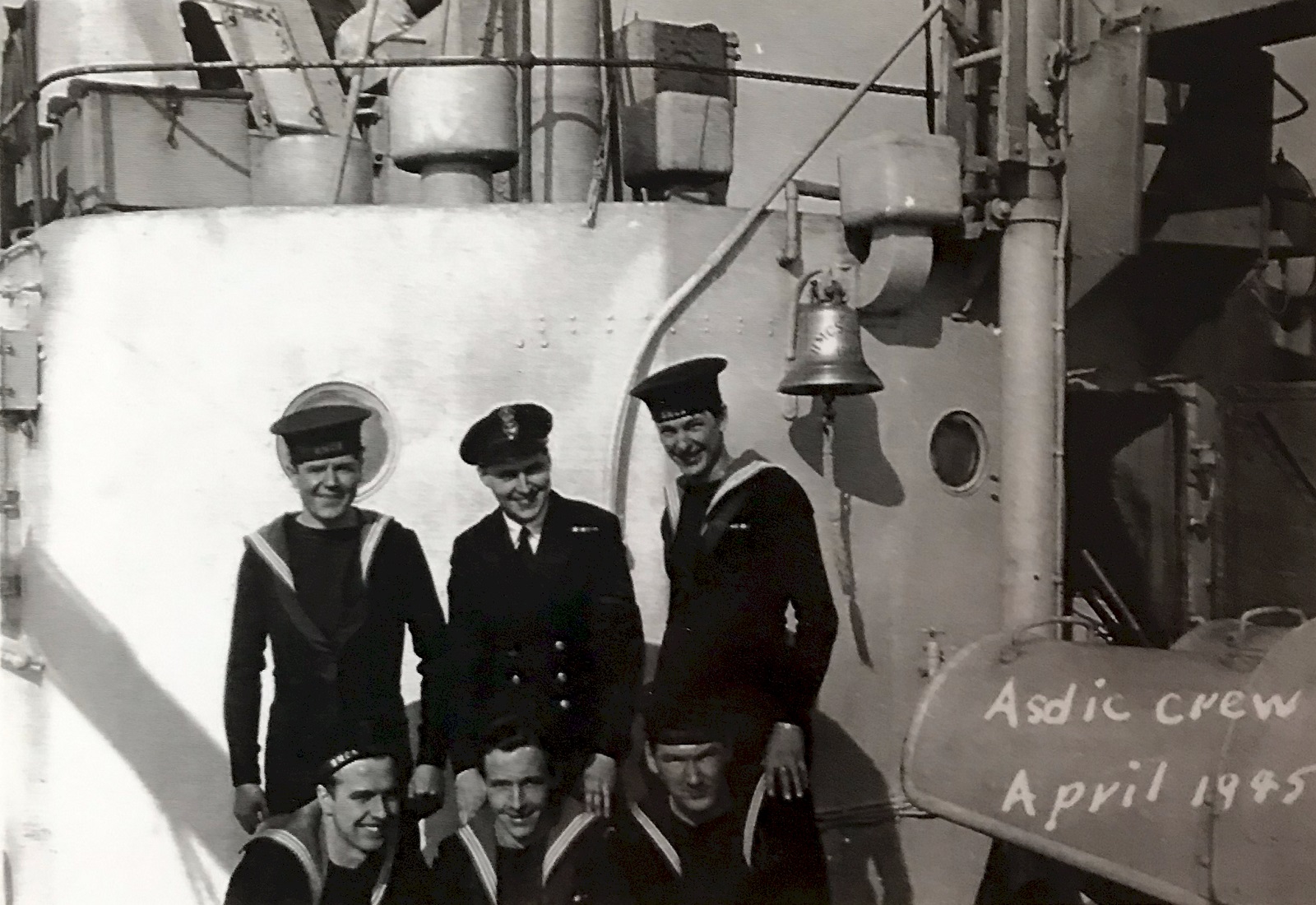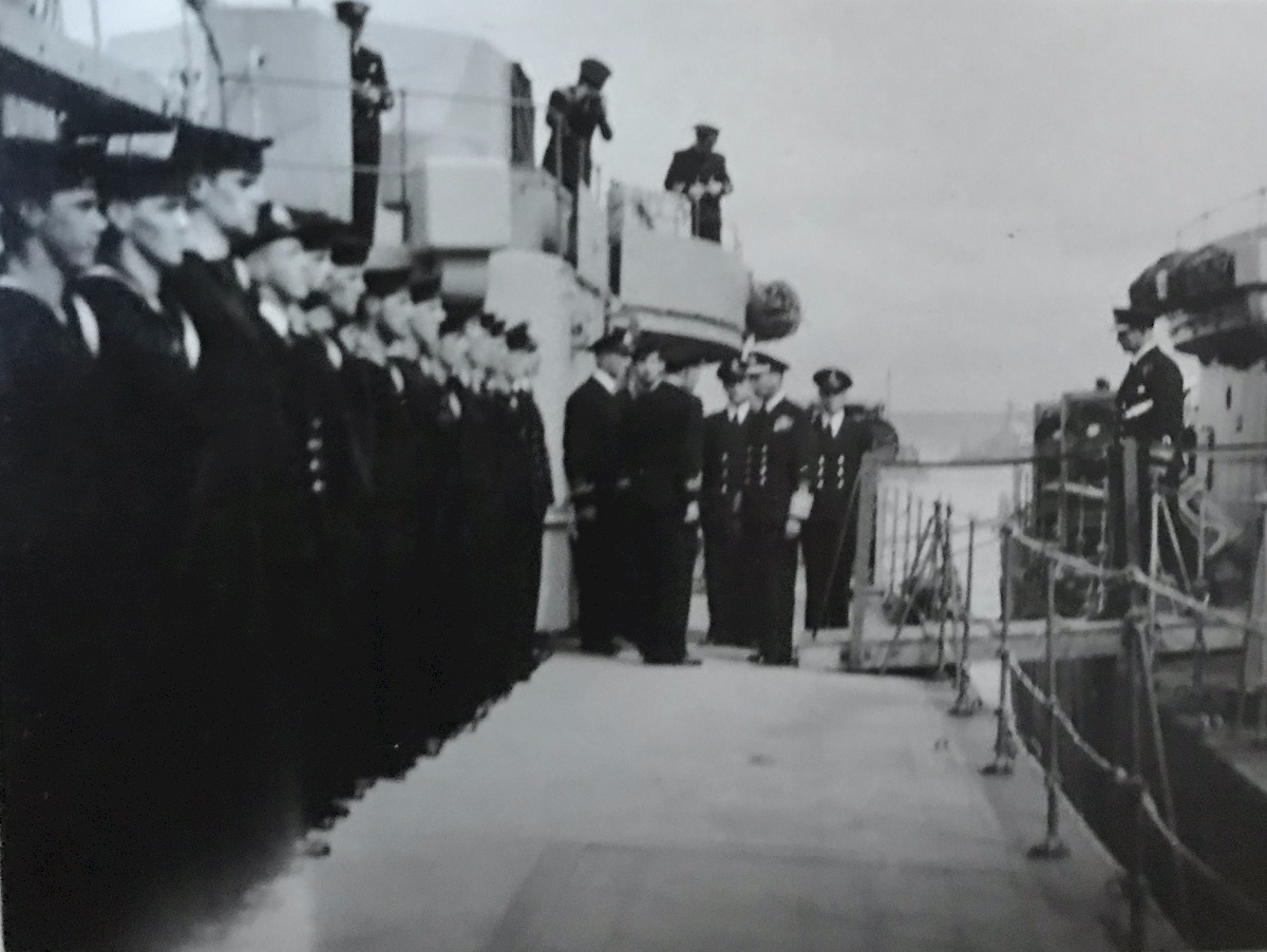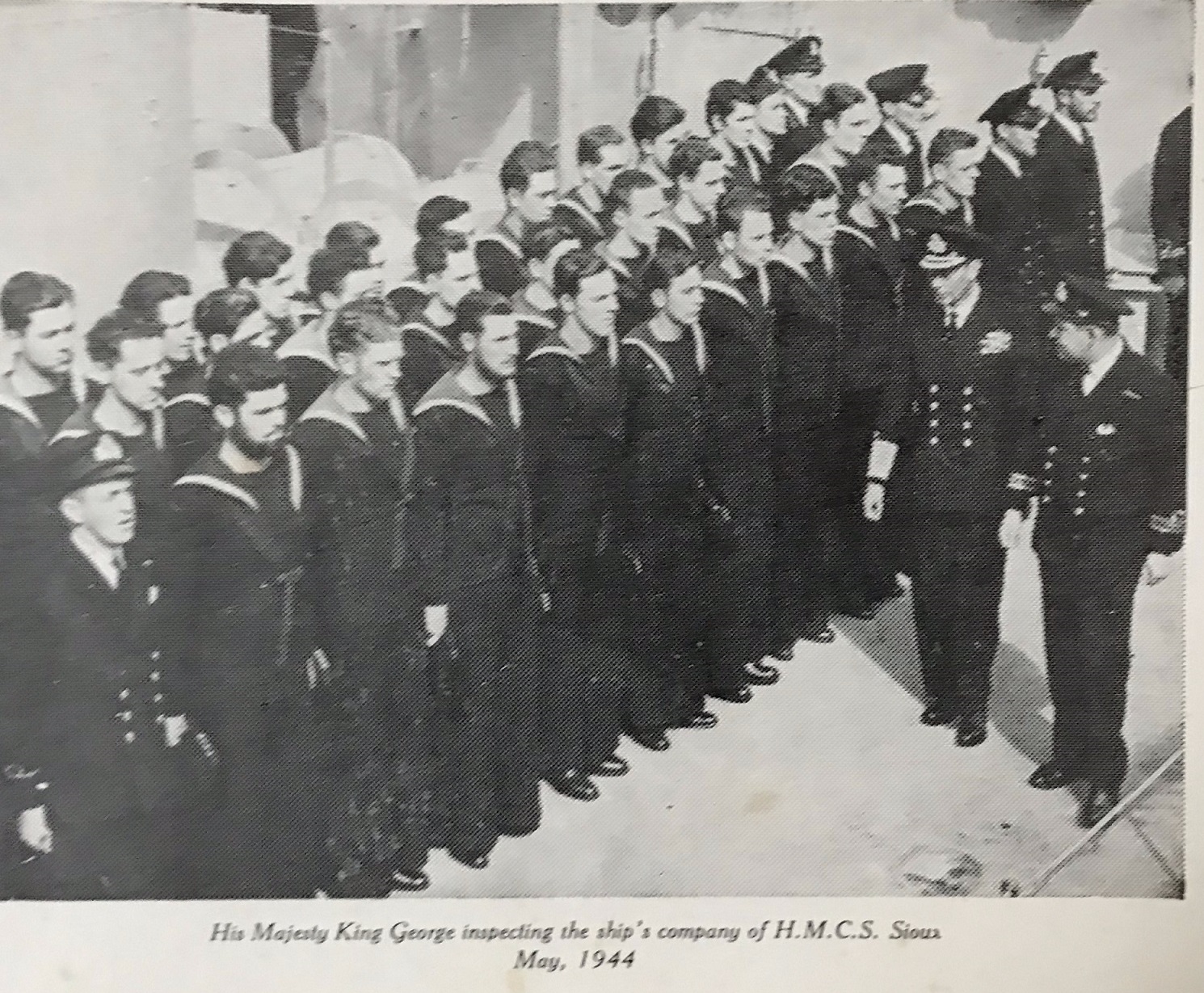 (... - ...) His Majesty King George VI visits HMCS SIOUX - May 1944 (...) HMCS SIOUX just finished an oiling at sea (...) Corsairs from HMS NABOB - Aug 1944 - shortly before she was torpedoed (...) HMCS SIOUX ASDIC crew 08 Oct 1944 - Harry Campbell - front 2nd from left (eyes closed)