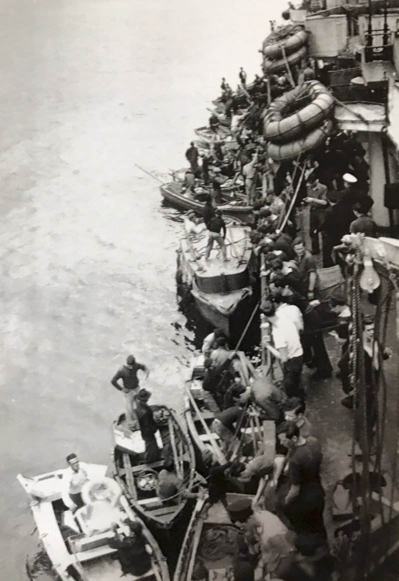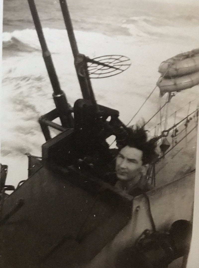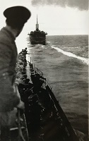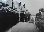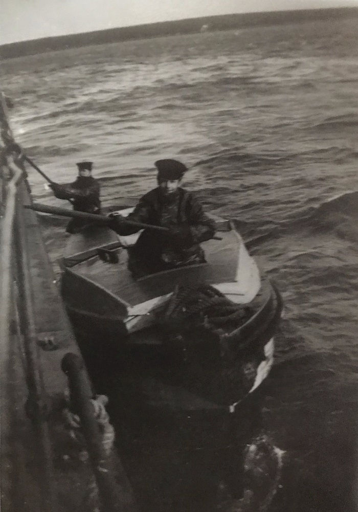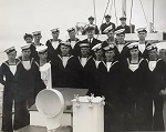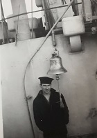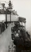 (...) Ship's boat alongside SIOUX. Boat's crew keeping the boat from drifting away (...) Harry Campbell by HMCS SIOUX's bell (...) Harry Campbell on AA mount on HMCS SIOUX