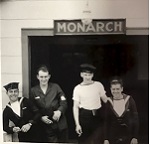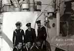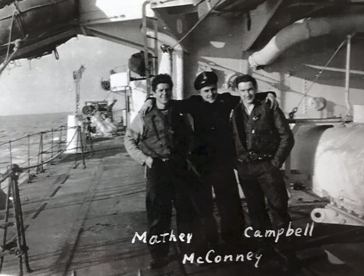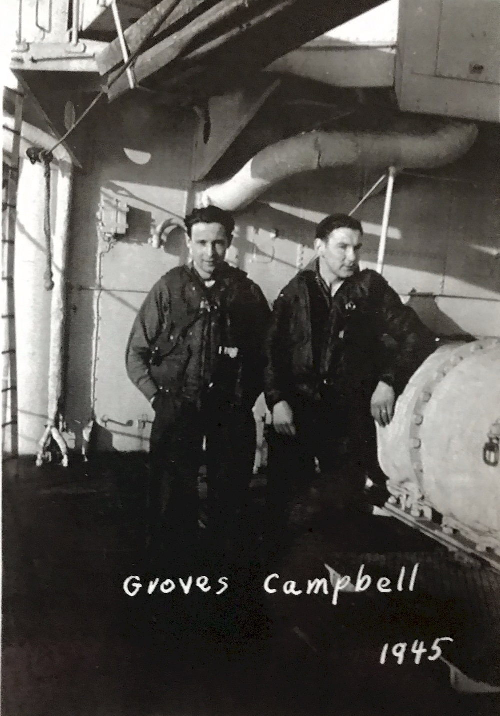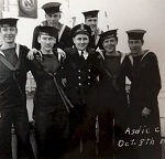 (...) Groves and Harry Campbell on SIOUX - 1945 (...) Mather, McConney, Harry Campbell on HMCS SIOUX (...) HMCS SIOUX ASDIC crew - Apr 1945 (...) Bum Boats alongside Sioux in Horta, Azores, Apr 1946, during her fueling stop enroute to Canada for refit (...) Ben Sheldon, Don Clayton, Harry Campbell, Carmen Mather July 1945. On back of photo "Ben and Mather are smiling because they were going home the next day"
