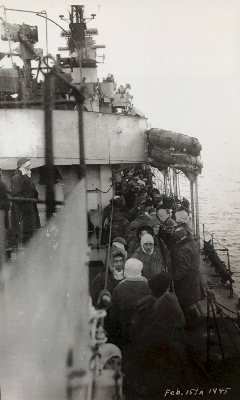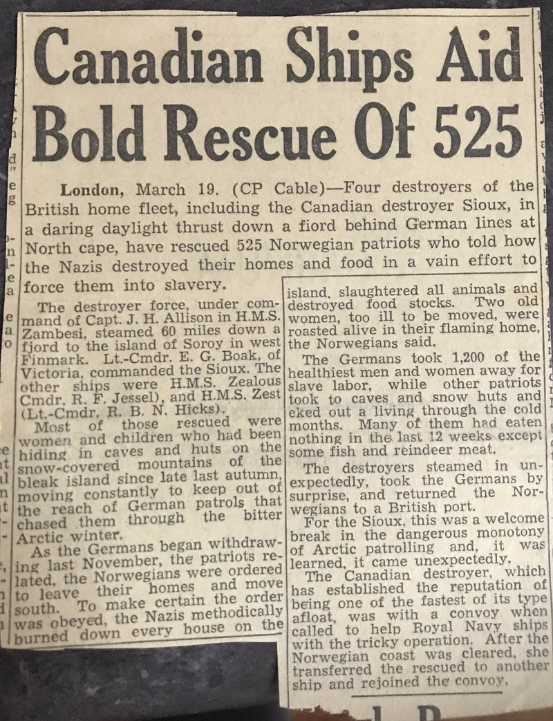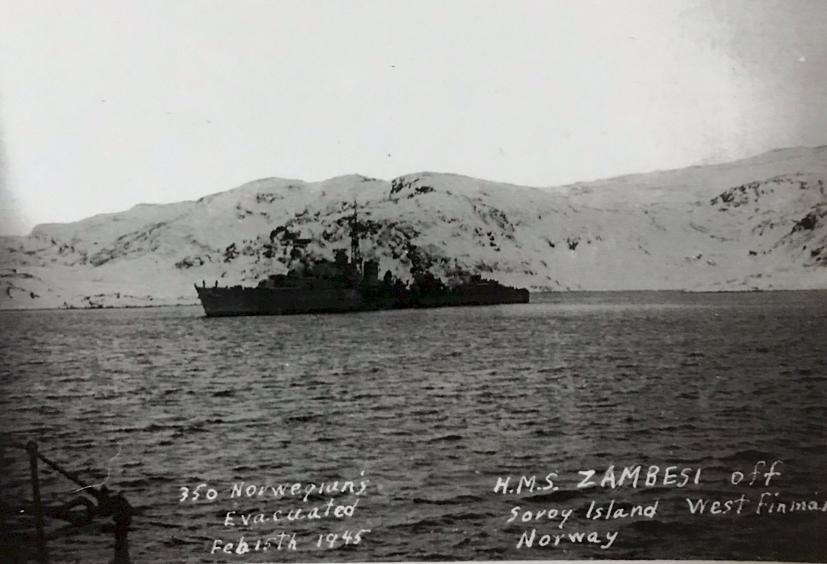 14 Feb 1945 - HMS Zealous, HMS Zest and HMS Zambesi and HMCS Sioux headed for Soroy Island at 30 Knots. They evacuated 500 Norwegians, mostly women and children, some old men. Gave some supplies to the Resistance People to carry on the fight on shore. They returned to Kola Inlet on 15 Feb 1945.