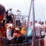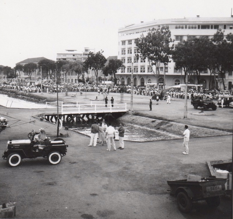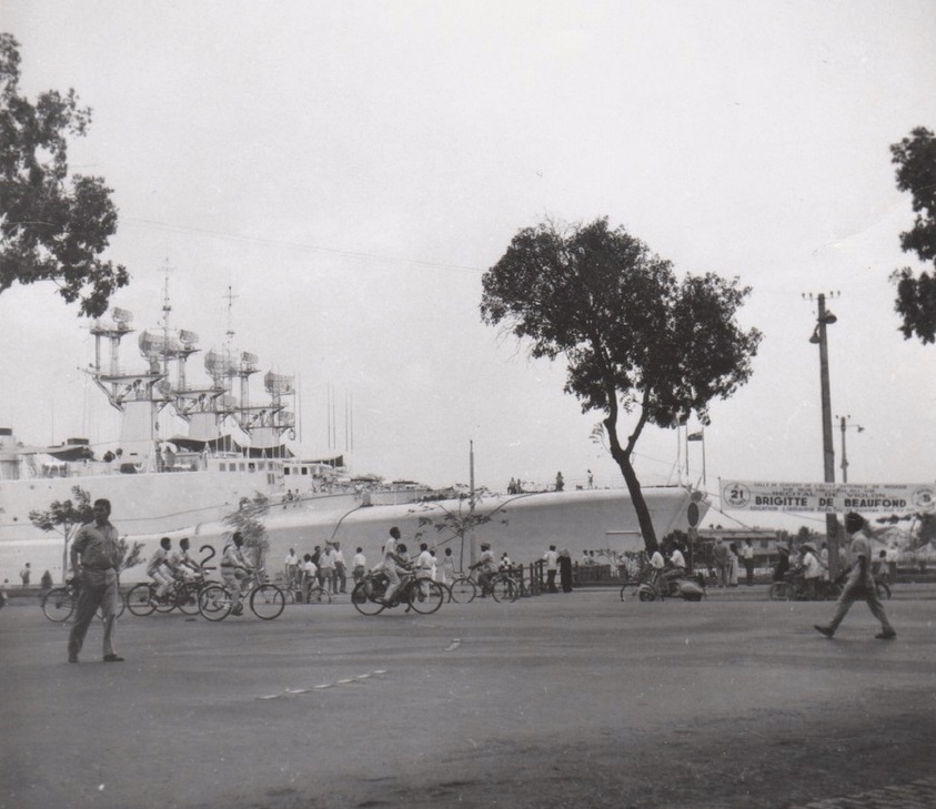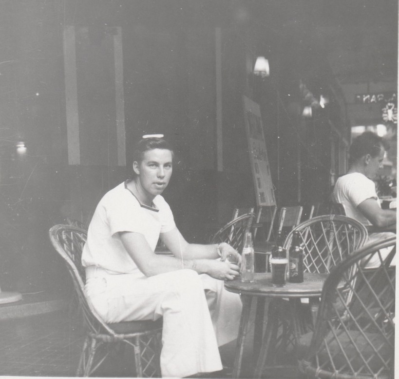 (TM38) HMCS SKEENA, HMCS FRASER and HMCS MARGAREE in Saigon, 1958 (TM39) Armed guards on jetty be bridge/walkway to keep crowds back in Saigon. Ship's jeep foreground on left (TM40) Ted Moller having a cool one in Saigon - 1958 (TM41) Suzie's Side Party alongside HMCS SKEENA - Hong Kong - 1958