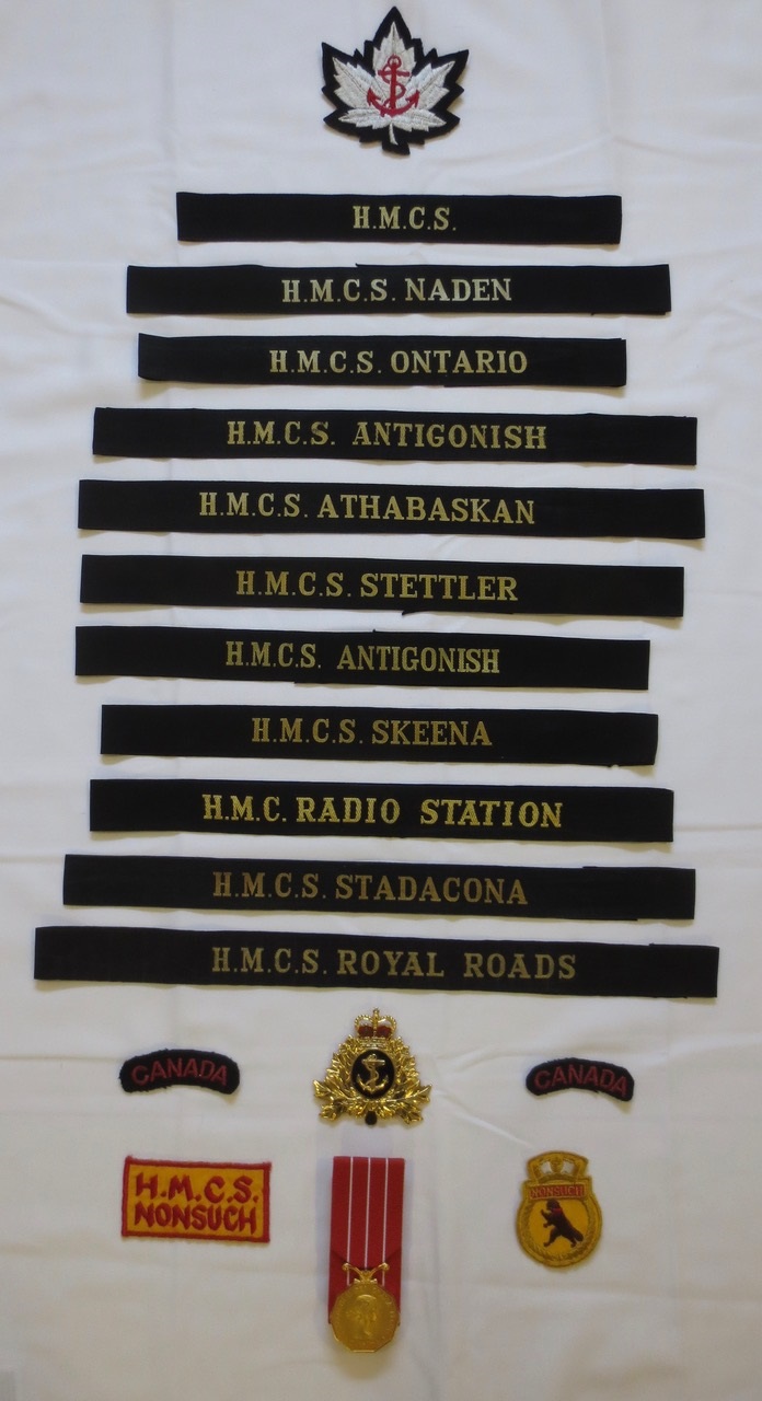 Memorabilia from Ted's time in the RCN - cap tallies, CD, HMCS NONSUCH jacket patch