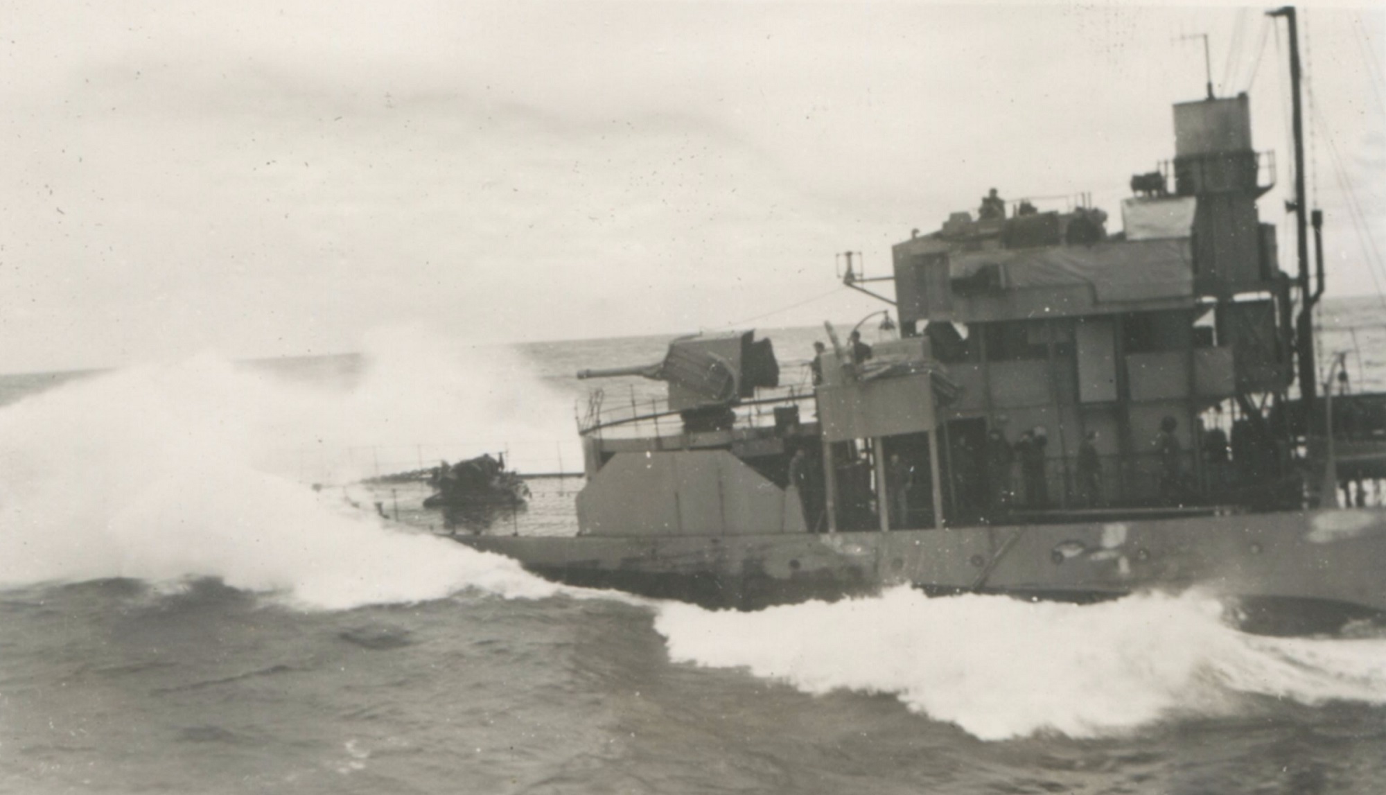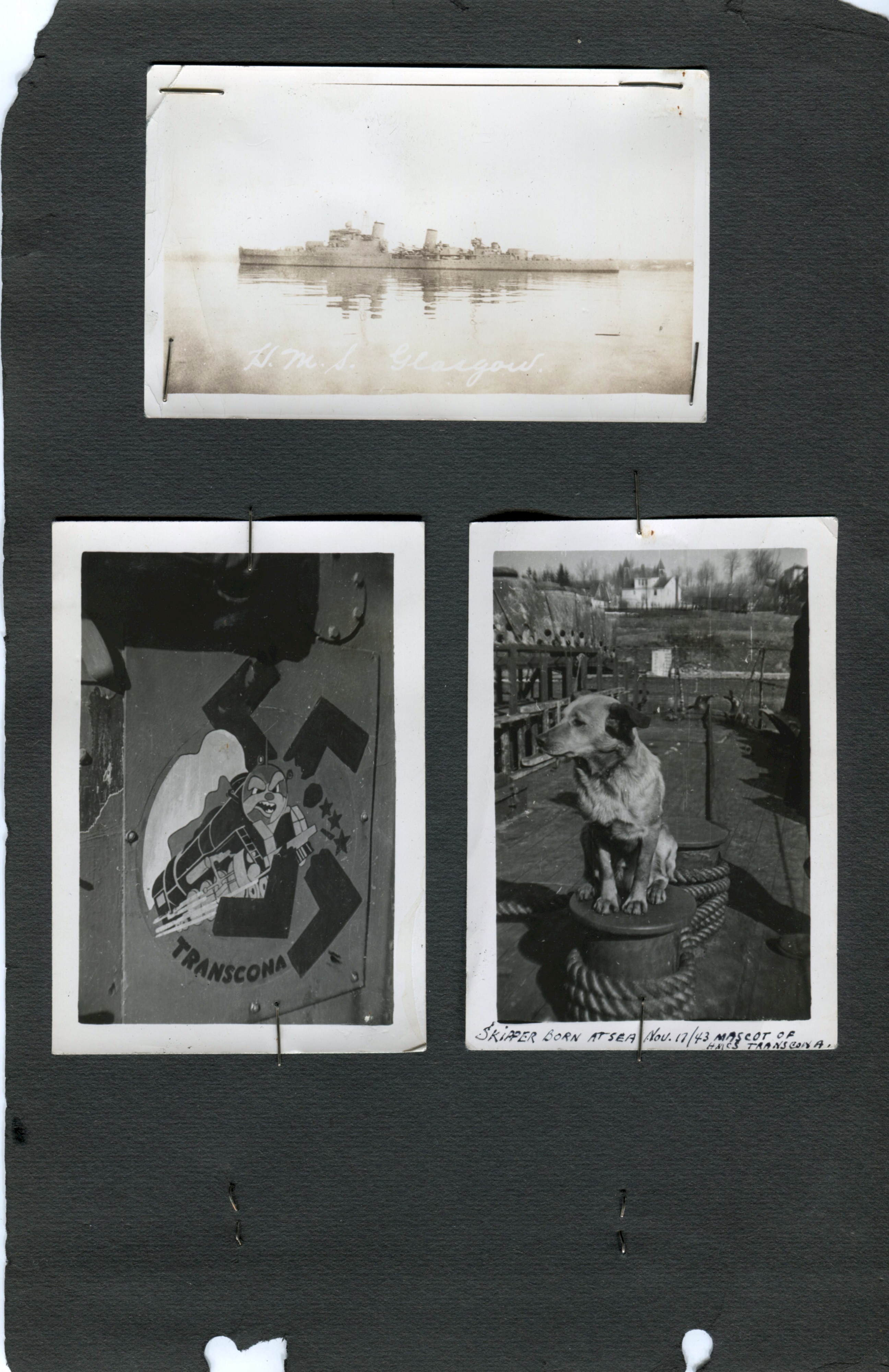 (WM15) HMCS TRANSCONA's gunshield art (WM16) HMCS TRANSCONA's mascot "Skipper". Born at sea 17 Nov 1943 (WM17) HMS GLASGOW - photo taken from HMCS TRANSCONA (WM18) A/Lt, Alexander Bell, HMCS TRANSCONA (WM19) Unidentified officer on HMCS TRANSCONA - believed to be A/LCdr Albert Elliott Gough