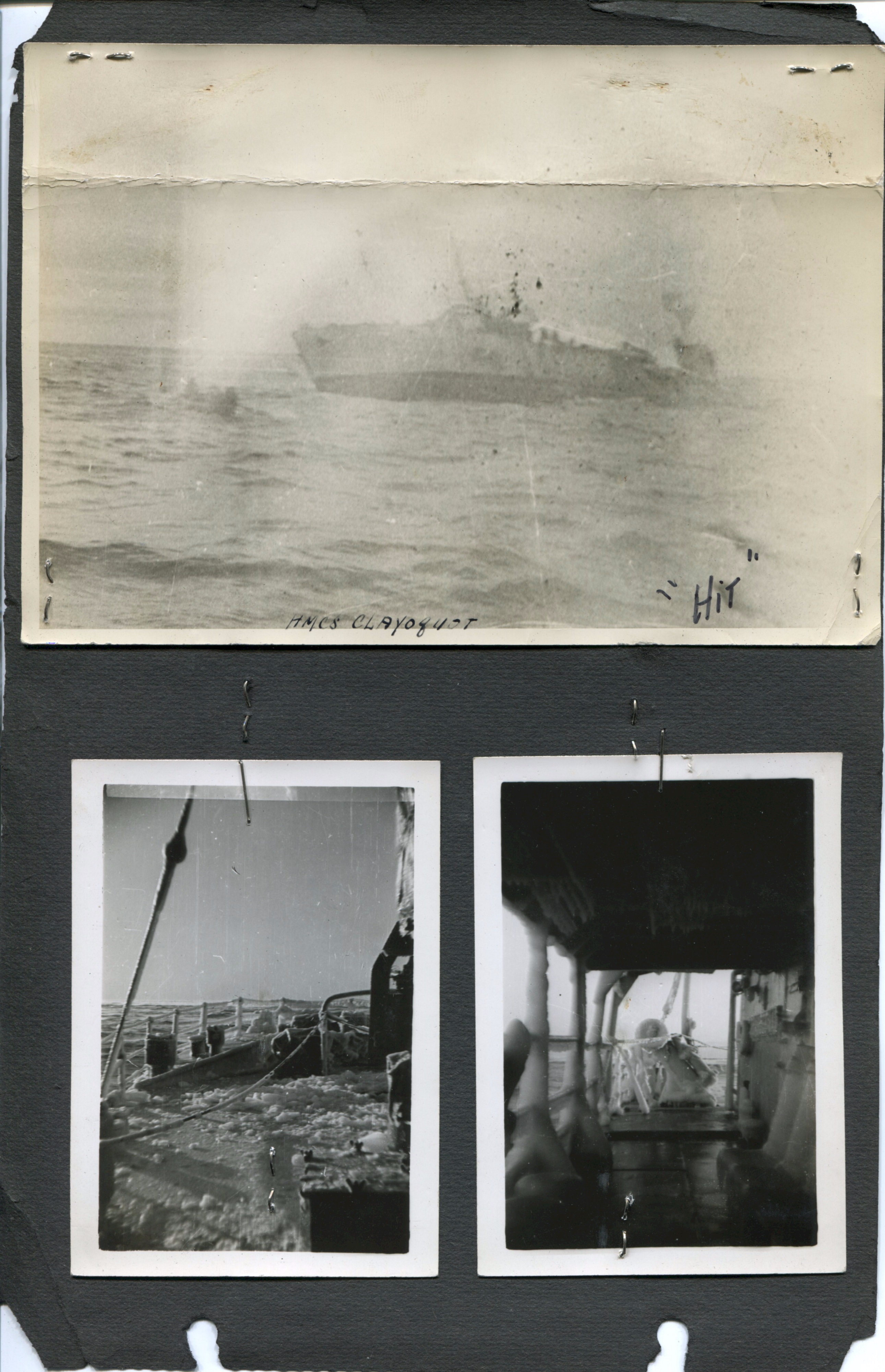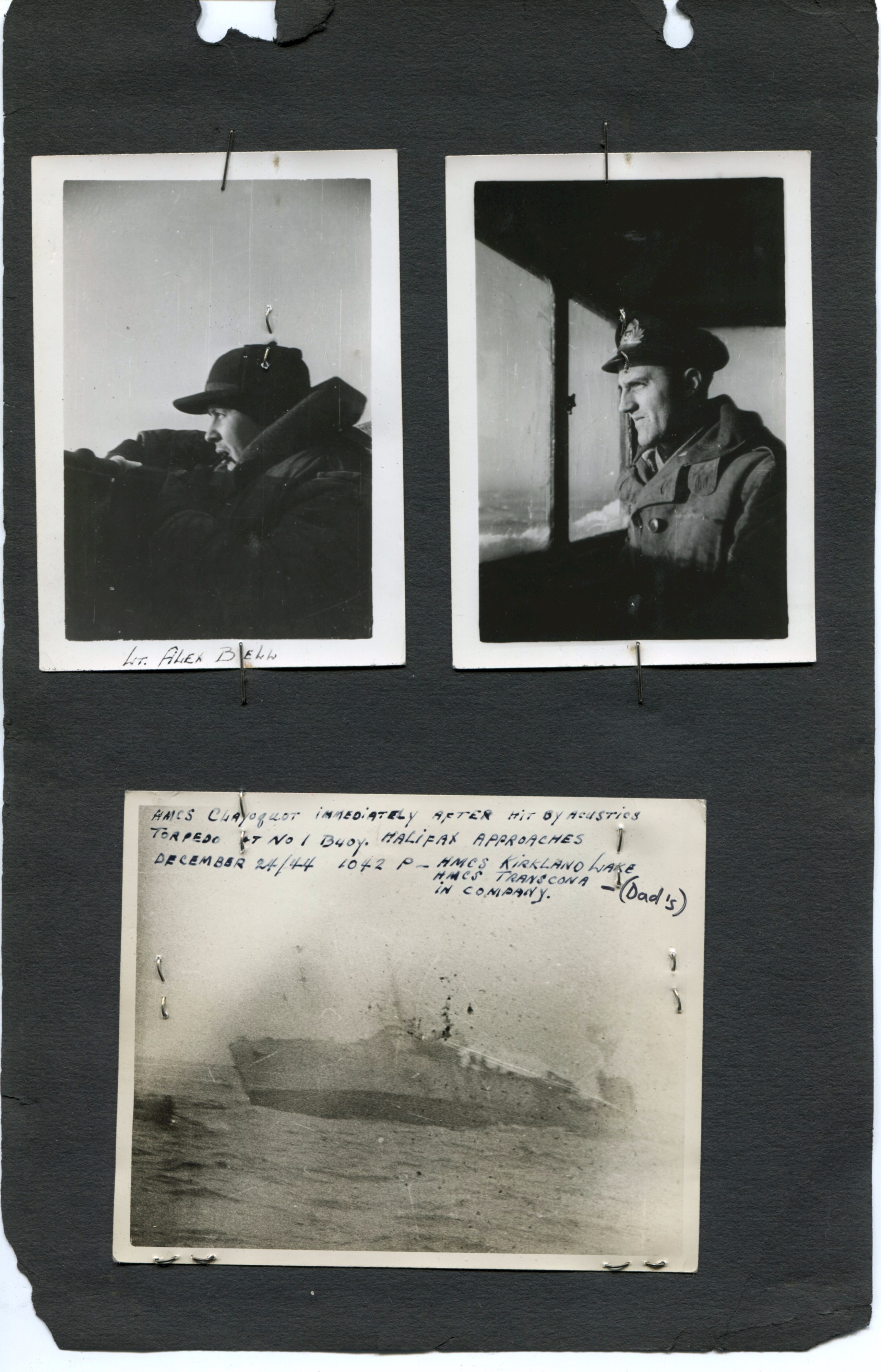 (WM25-WM27) HMCS CLAYOQUOT - Immediately after being hit by acoustics torpedo at No. 1 Buoy, Halifax Approaches, 24 Dec 1944, 1042 P. Ships in Company - HMCS KIRLAND LAKE, HMCS TRANSCONA
