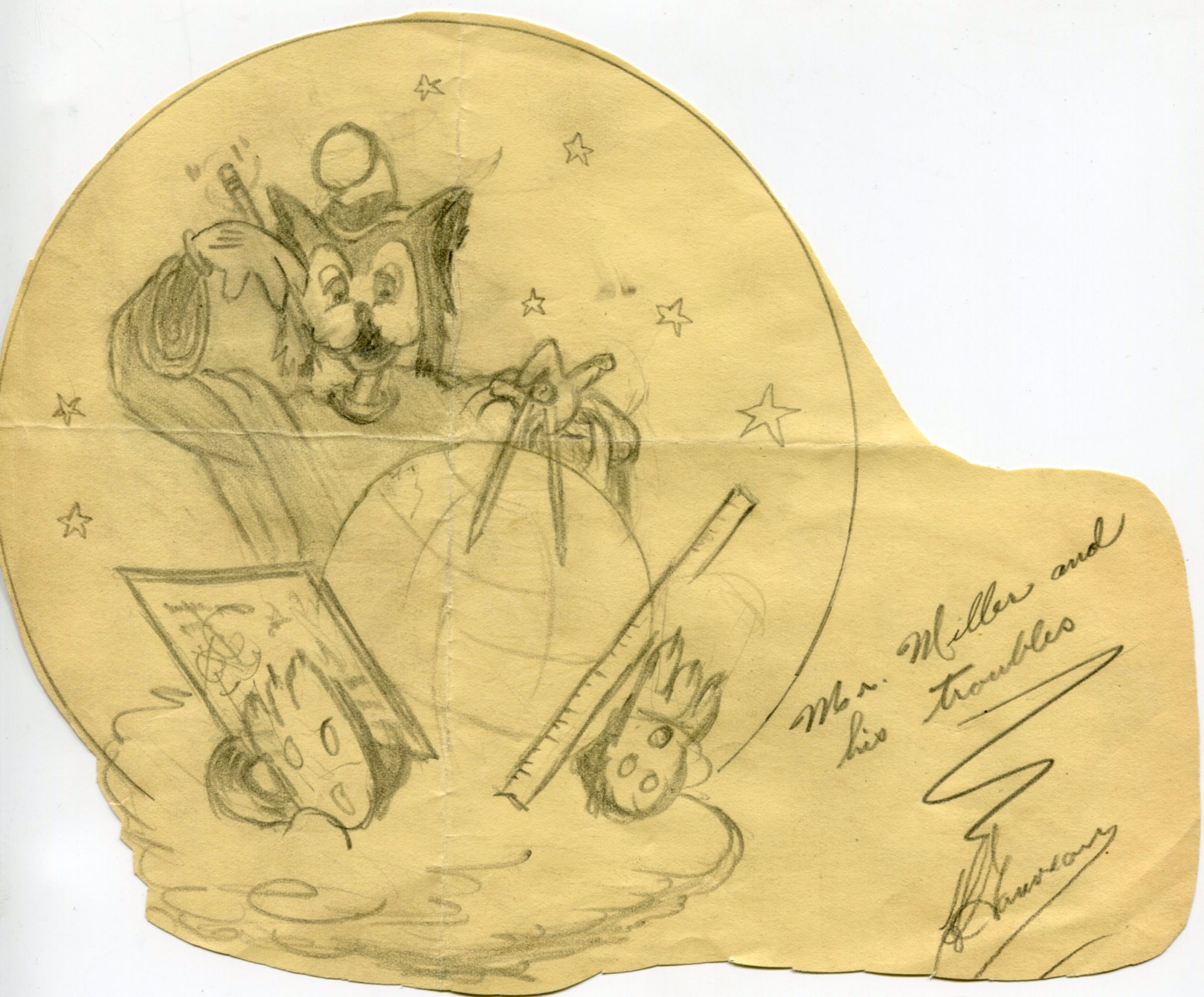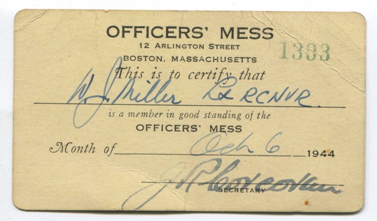 (WM00) Portrait of SLt Miller (WM01) Lt W.J. Miller, Halifax, fall 1944 (WM02) "Mr. Miller and his troubles" (WM03) Officers' Mess, Boston, Mass., USA, Membership card (WM04) HMCS TRANSCONA (from the inside of a card - possibly a Christmas card)