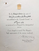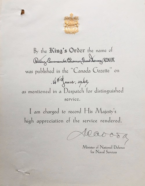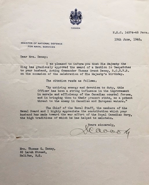 Mentioned in Despatches Citation - DENNY, Thomas Grant, A/Cdr, Mention in Despatches (M.I.D.), RCNVR, Canadian Coastal Forces - Awarded as per Canada Gazette of 16 June 1945 and London Gazette of 14 June 1945. "By untiring energy and devotion to duty, this Officer has been a strong influence in the improvement in morale and efficiency of the Canadian Coastal Forces, and in bringing them to their present state, as a potent threat to the enemy in Canadian and European waters."