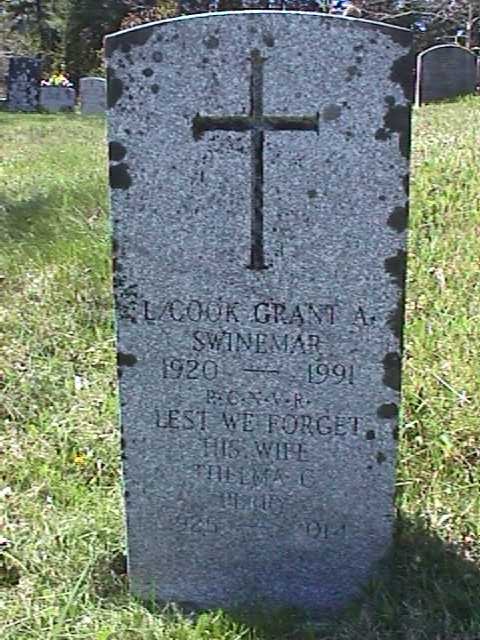 SWINEMAR, Grant Andrew - 70, Lower Grant Road, Chester Basin, died Tuesday in Fishermen's Memorial Hospital, Lunenburg. Born in Gold River, he was a son of the late Clarence and Jessie (Hiltz) Swinemar. He was a leading cook with the RCN during the Second World War. He was a retired boiler maker and welder. He was a member of Royal Canadian Legion Everett Branch 88, Chester Basin. He is survived by his wife, the former Thelma Perry; four sons, Garnet, Purcell's Cove; Robert, Halifax; Marshall, Chester Basin; Sgt. Kirby, Comox, B.C.; two daughters, Cheryle (Mrs. Peter Kelly), Barrington; Debbie (Mrs. Barry Rafuse), Western Shore; two sisters, Dorothy (Mrs. Jack Condon), Halifax; Edna Johnston, MacAdam, N.B.; 13 grandchildren. He was predeceased by three brothers, Boyd, Marshall, Clyde; two sisters, Alice, Molly. The body is in Davis' Funeral Home, Chester, visiting 2-4, 7-9 p.m. today, where a legion service will be 7:30 p.m. today. Funeral will be 2 p.m. Friday in St. John's Anglican Church, Chester Basin, Rev. Carolyn Tomlin officiating. Burial will be in Western Shore Cemetery. Immediate family flowers only, donations to Veteran's Memorial Bursary Fund, Everett Branch 88, c/o Earl Zwicker, Chester Basin or Canadian Cancer Society. (Halifax Chronicle-Herald, Thursday 21 Feb 1991 / Researched by George Newbury)