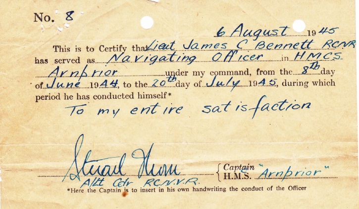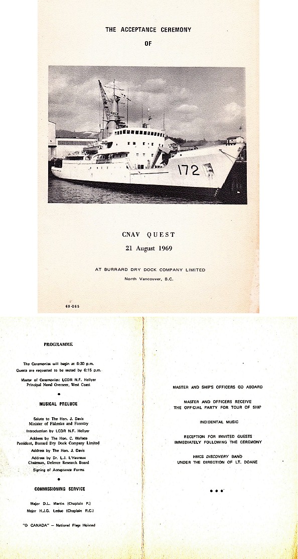 Ships served in: HMCS ARNPRIOR - Appointed to Arnprior 08 Jun 1944 as a Mate, RCNR CNAV QUEST - Served in Quest as Master from her commissioning in Aug 1969 until his retirement in 1979