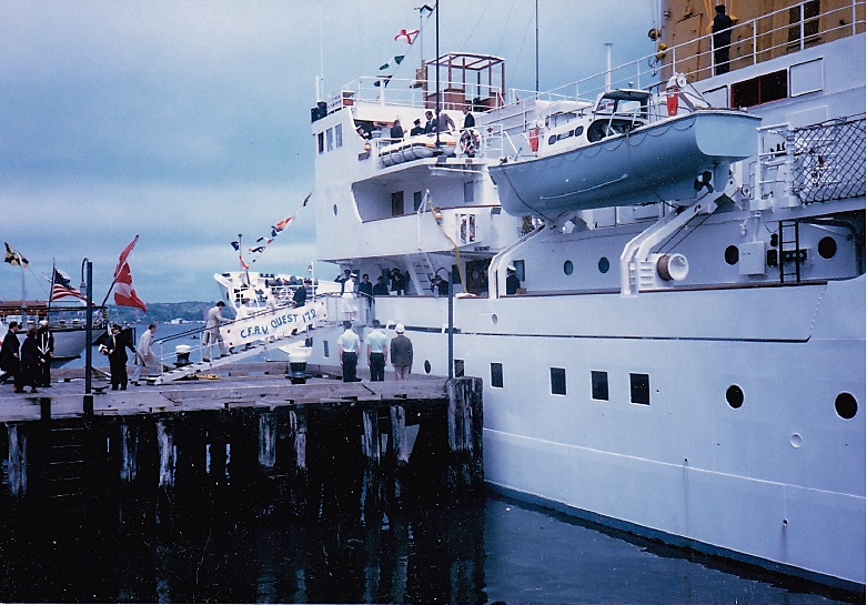 (JB18) CFAV QUEST docking at the jetty behind the Naval Museum in Halifax. CSS ACADIA visible at her berth (JB19) Prince Andrew being welcomed aboard CFAV QUEST for the 1985 Naval Review (JB20) Gov. General Jean Sauve being welcomed aboard CFAV QUEST (JB21) CFAV QUEST leaves the jetty to commence the sail past of the fleet anchored in Bedford Basin for the 1985 Naval Review in celebration of the 75th Anniversary of the RCN. Note the Royal Standard flying on QUEST's mast.