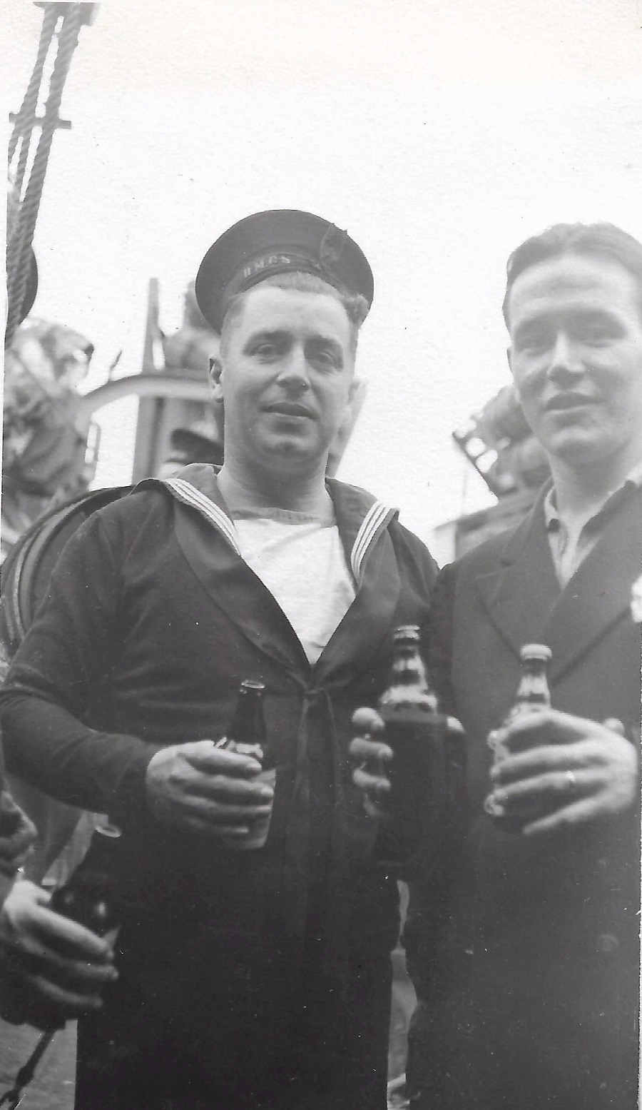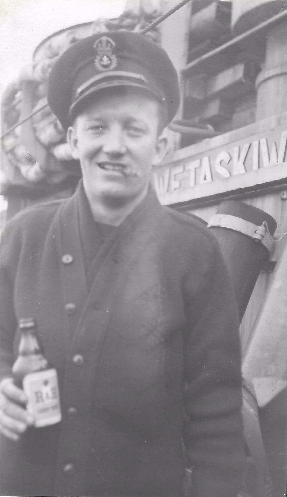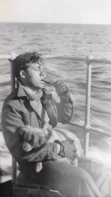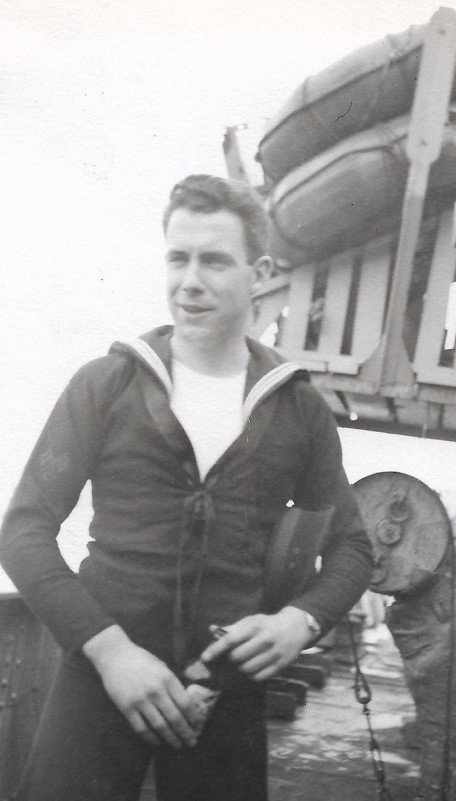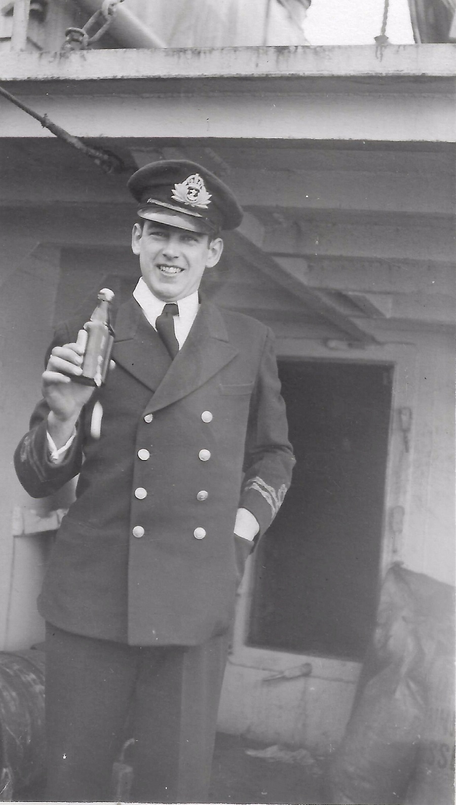 (LK07) LS Lewis Kennett wearing a Lt's uniform on HMCS WETASKIWIN - Christmas Dec 1944  (LK11) Note the two Christmas tree raised up on the yard arms.