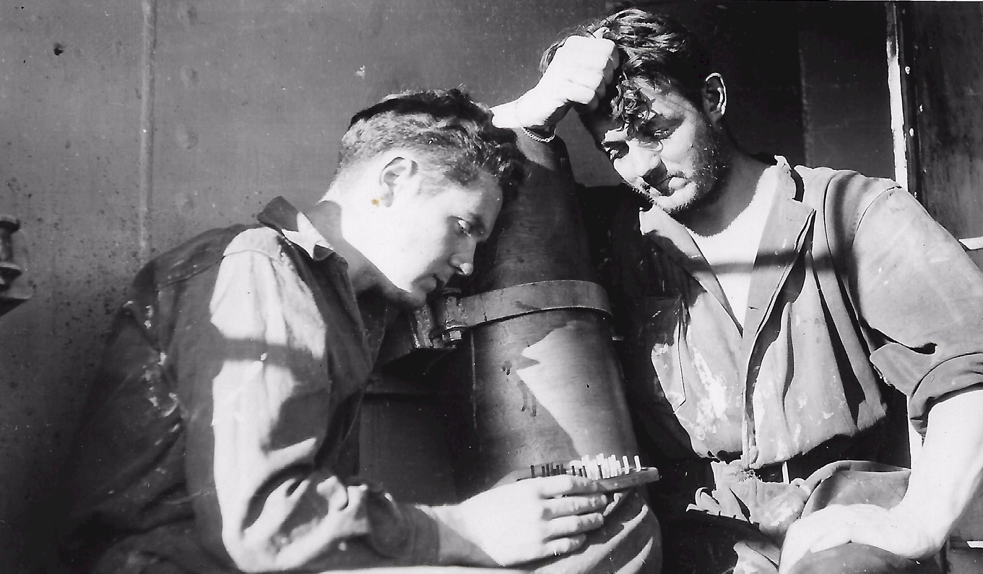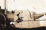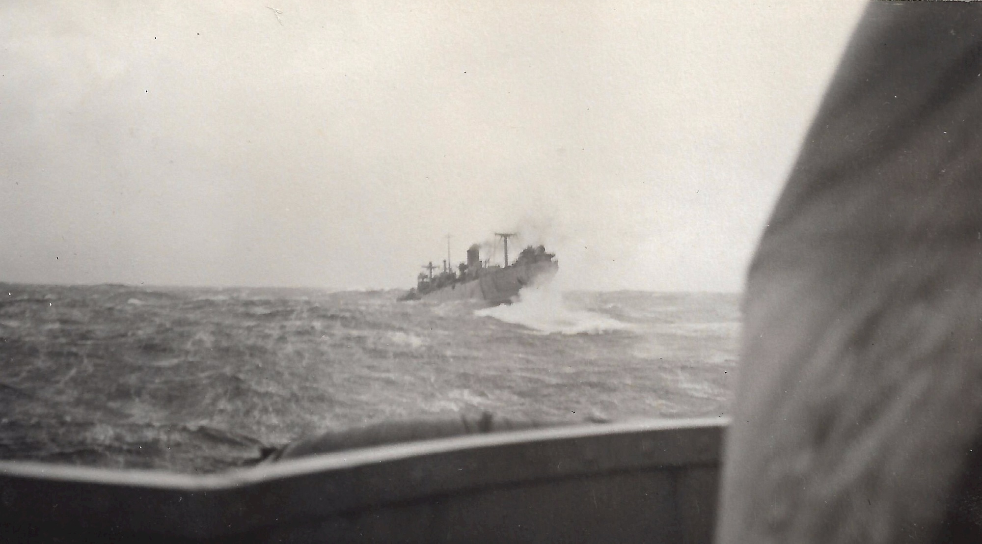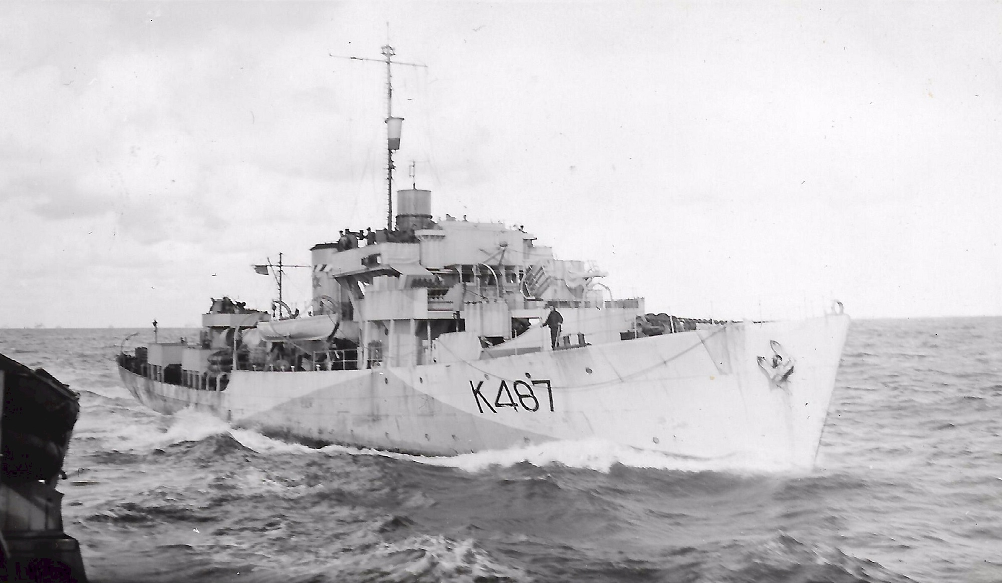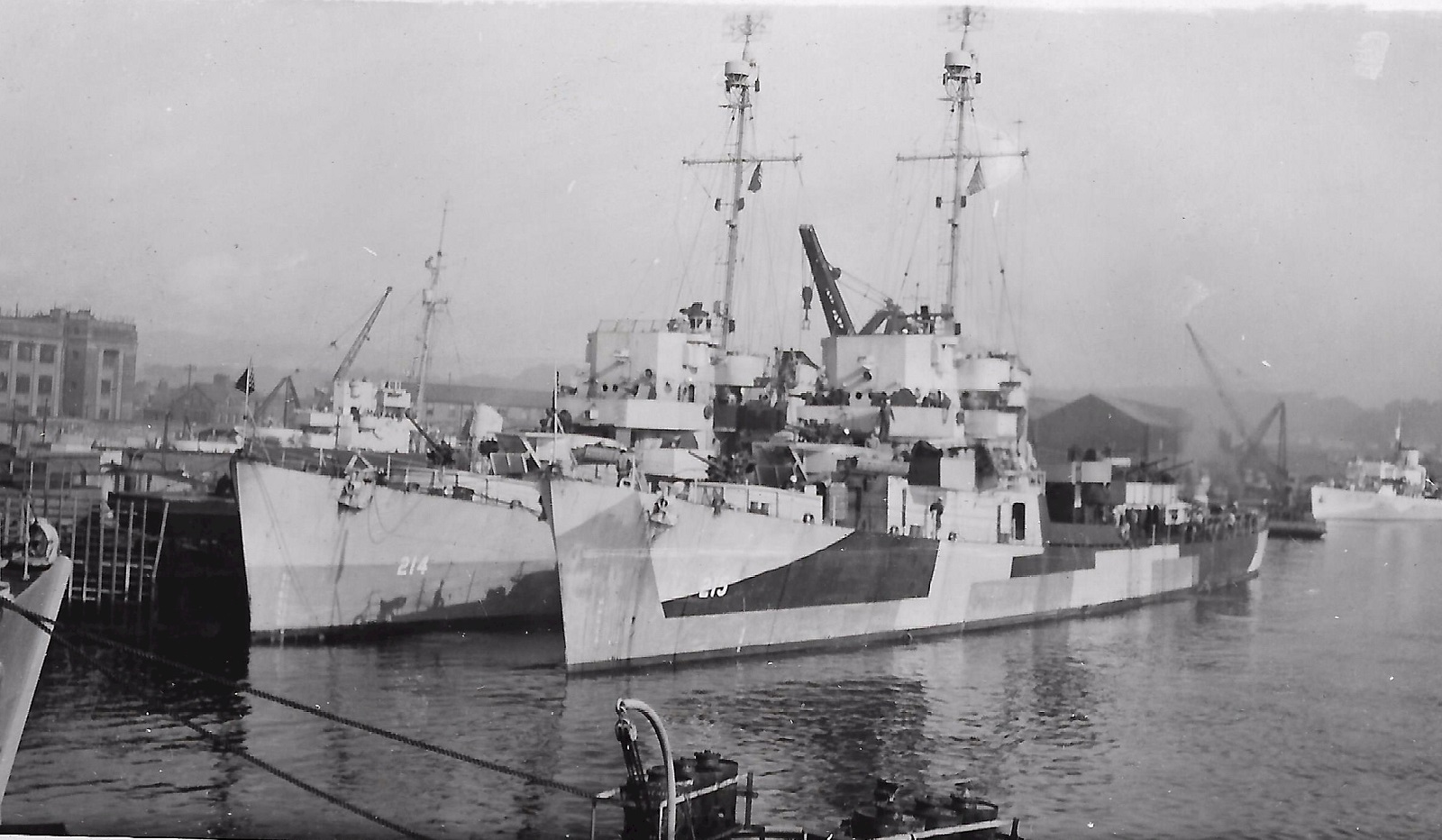 (LK18) Unknown merchant ship   (LK19) The Wet-Ass-Queen" gunshield art on HMCS WETASKIWIN  (LK20) HMCS LONG BRANCH K487 between Apr-Oct 1944 - photo taken from HMCS WETASKIWIN  (LK21) USS TRACY 214 and USS BORIE 215 - location unknown.  USS BORIE had been heavily damaged in a running battle with U-405 on 01 Nov 1943 in which U-405 was sunk.  On 02 Nov 1943, after her crew was removed, she was sunk by allied ships and aircraft.