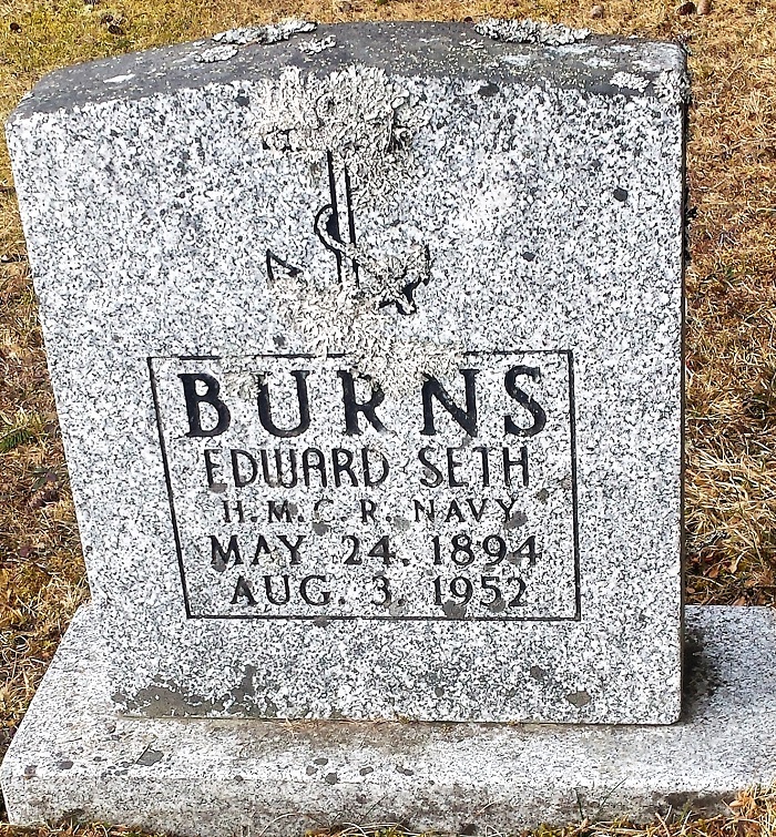 Edward Seth Burns is buried in the Riverside Cemetery Sonora, Guysborough Co., NS. Note: The headstone for Edward Seth Burns reads that he died on 03 Aug 1952, however, his Nova Scotia Death Certificate has his date of death as 18 Aug 1952. The doctor who signed his death certificate had recorded that he last saw the patient alive on 12 Aug 1952.