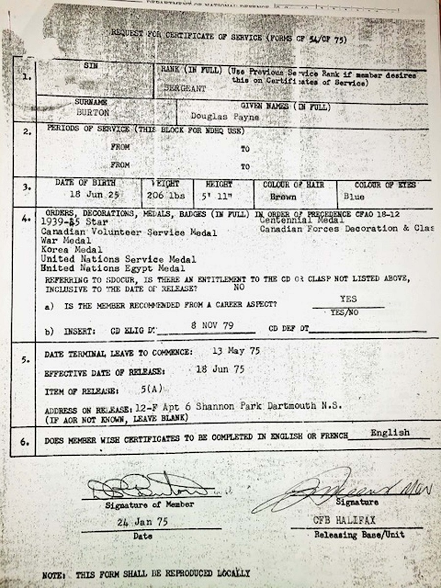 Awards and Decorations: The 1939-45 Star; The Canadian Volunteer Service Medal (CVSM); The 1939-45 War Medal; The Korea Medal; The United Nations Service Medal; The United Nations Egypt Medal; The Centennial Medal; The Canadian Forces Decoration & Clasp (CD)