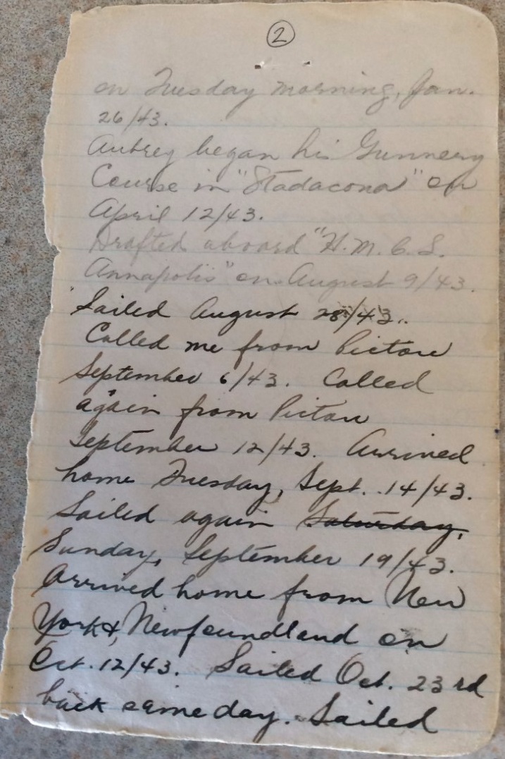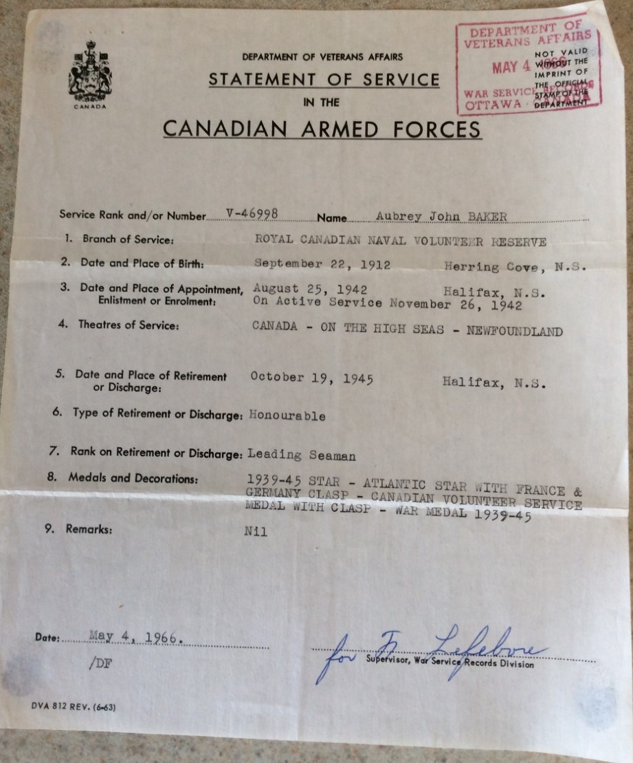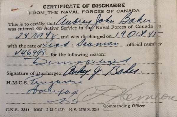 Aubrey enlisted 25 Aug 1942 in Halifax, NS, and commenced Active Service on 28 Nov 1942. He was demobilized at Halifax on 19 Oct 1945.