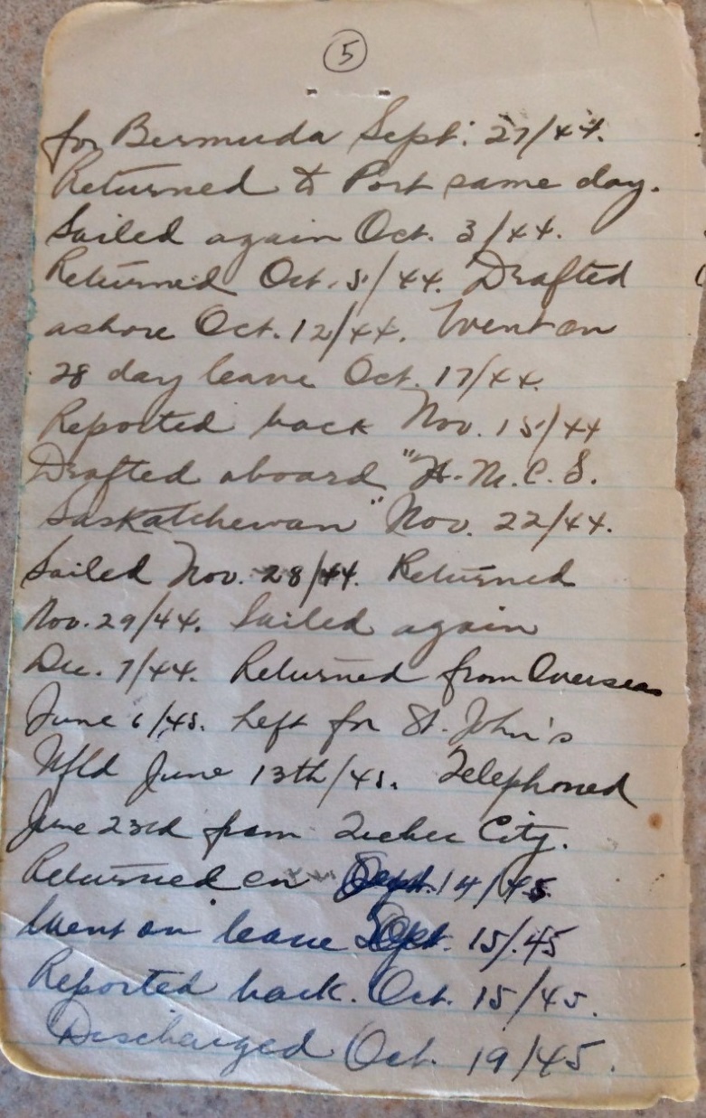 Ships served in: HMCS ANNAPOLIS - Drafted to Annapolis 09 Aug 1943 * Rated LS 04 Mar 1944 HMCS ETTRICK - Served in Ettrick 12 Apr 1944 (reported onboard 17 Apr 1944) HMCS KIRKLAND LAKE - Served in Kirkland Lake 02 Aug 1944 - 11 Oct 1944 HMCS SASKATCHEWAN - Drafted to Saskatchewan 22 Nov 1944