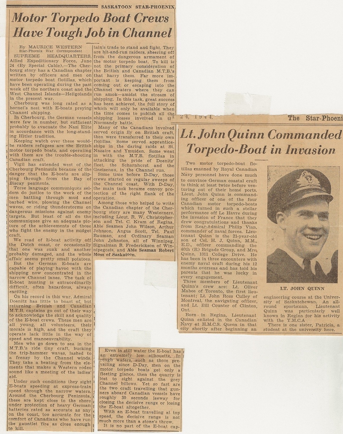 (JQ01) Article from the Saskatoon Star-Phoenix on the MTB crews and Lt John Quinn (JQ02) John Quinn's lighter which shows the ships that he served in during WW2