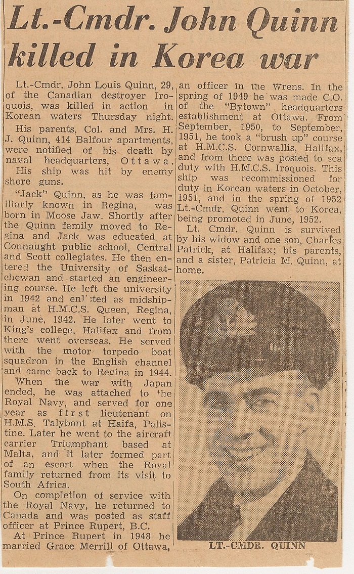 QUINN, John Louis, LCdr, O-60710, RCN, killed - 02 Oct 1952, HMCS IROQUOIS - Son of Colonel H.J. Quinn MM and Rosa Quinn of Regina, SK; husband of Grace Lillian (Merrill) Quinn of Armdale, NS; father of Charles Patrick Quinn of Armdale, NS; brother of Patricia Mary Quinn.