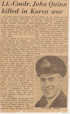 Mentioned in Despatches citation: Quinn, John Louis, LCdr, RCN, Mentioned in Despatches (M.I.D.) Posthumous, HMCS IROQUOIS - Canadian Gazette 13 Jun 1953: "Throughout the whole period of Korean operations, until his death in action, he set a fine example of leadership in his quarters. His devotion to duty, courage and cheerfulness at all times were an inspiration to the gun crews he commanded."