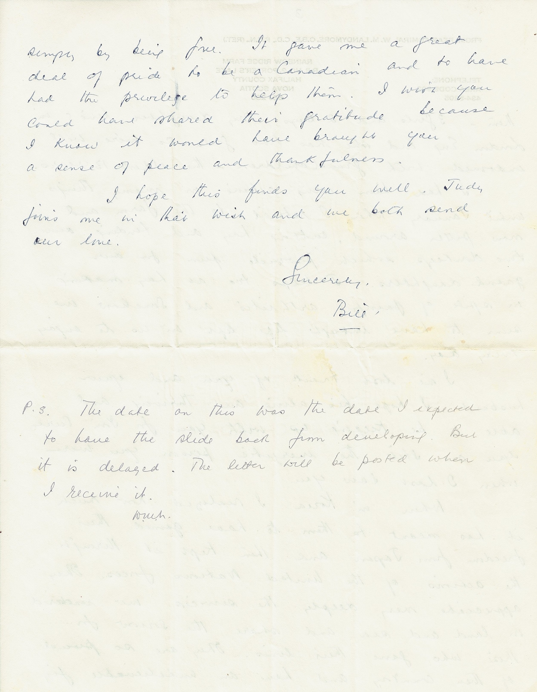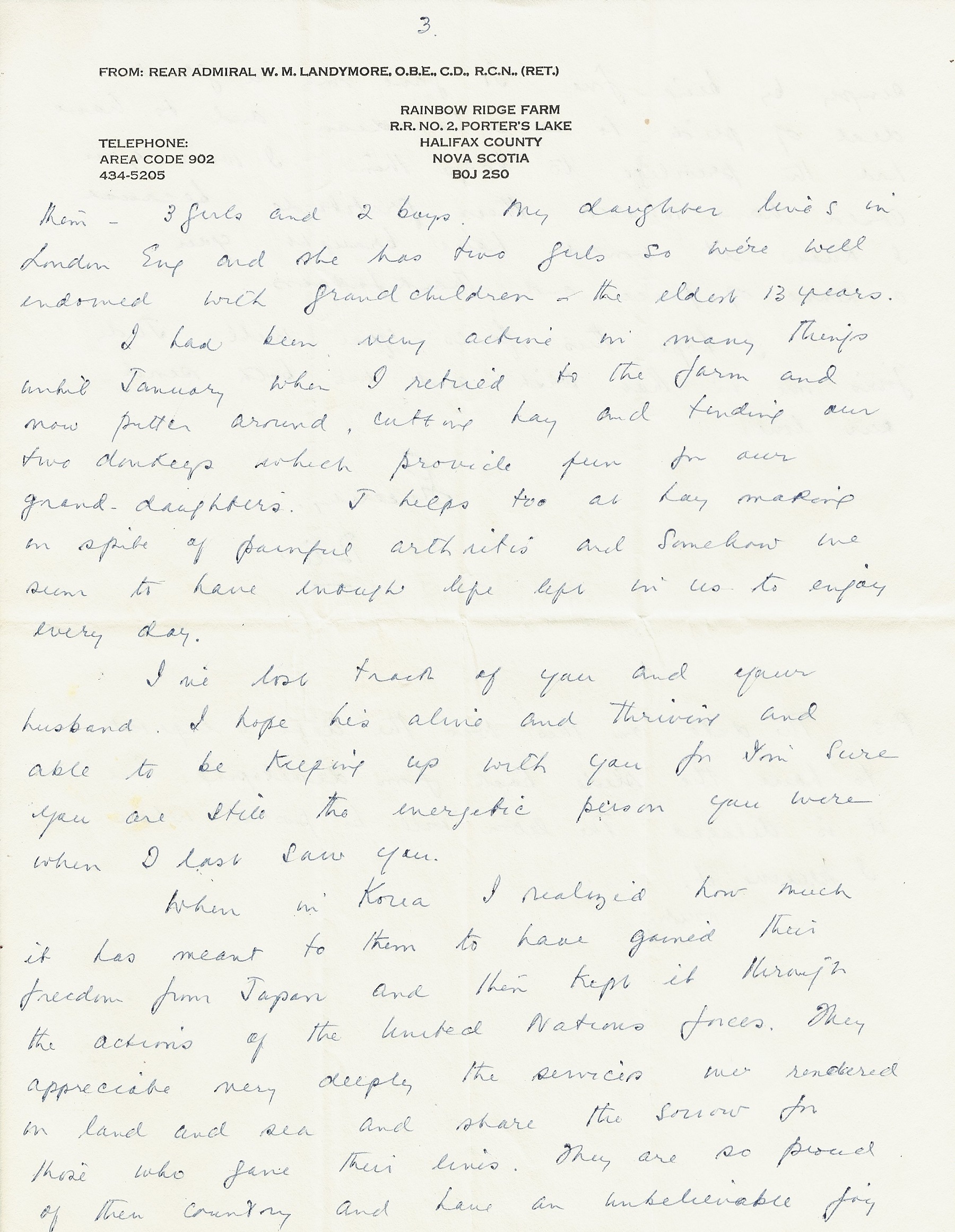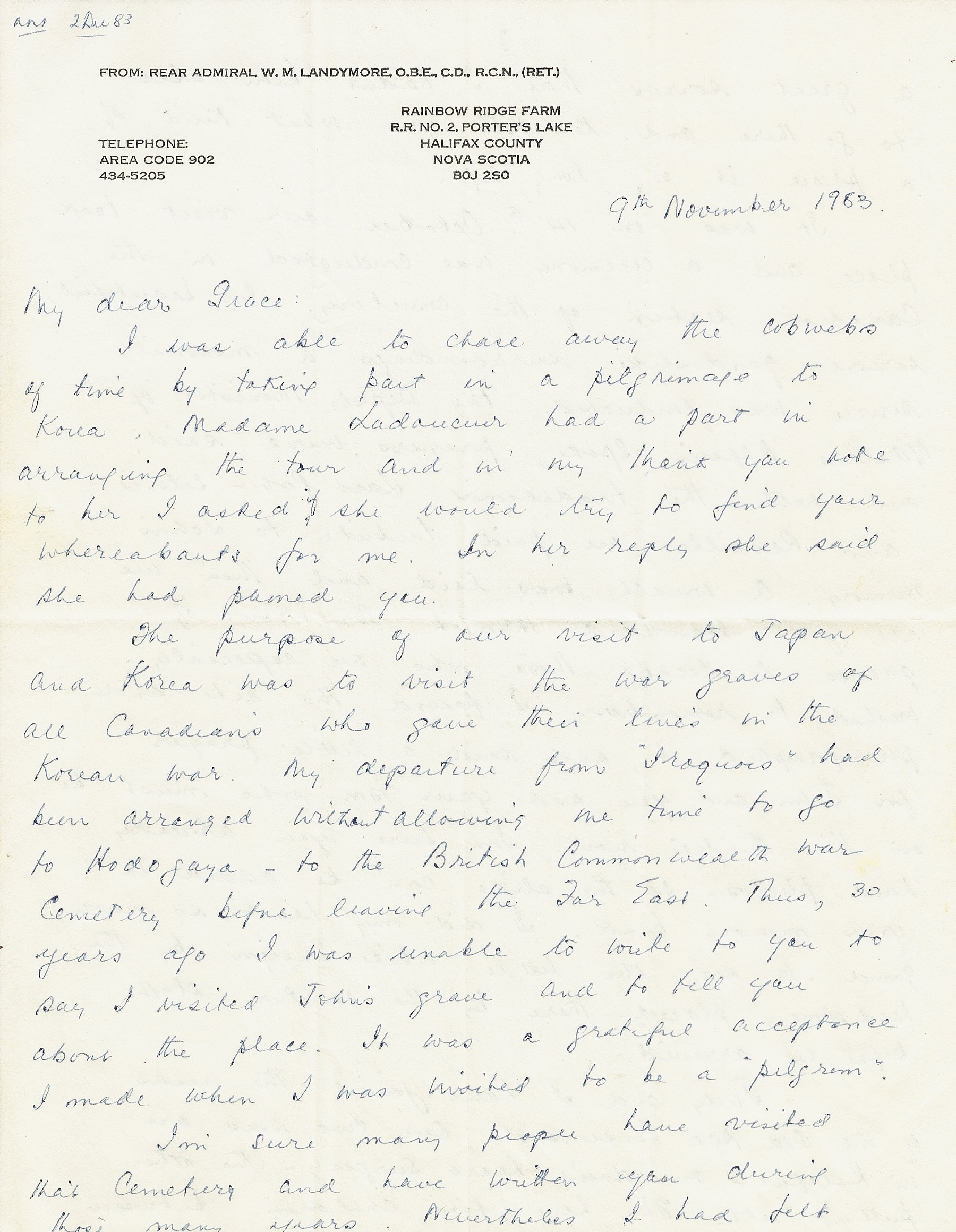 (JQ28-JQ31) Letter to Grace Gillard from RAdm William (Bill) Landymore, RCN, ret'd - dated 09 Nov 1983
