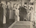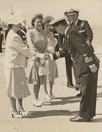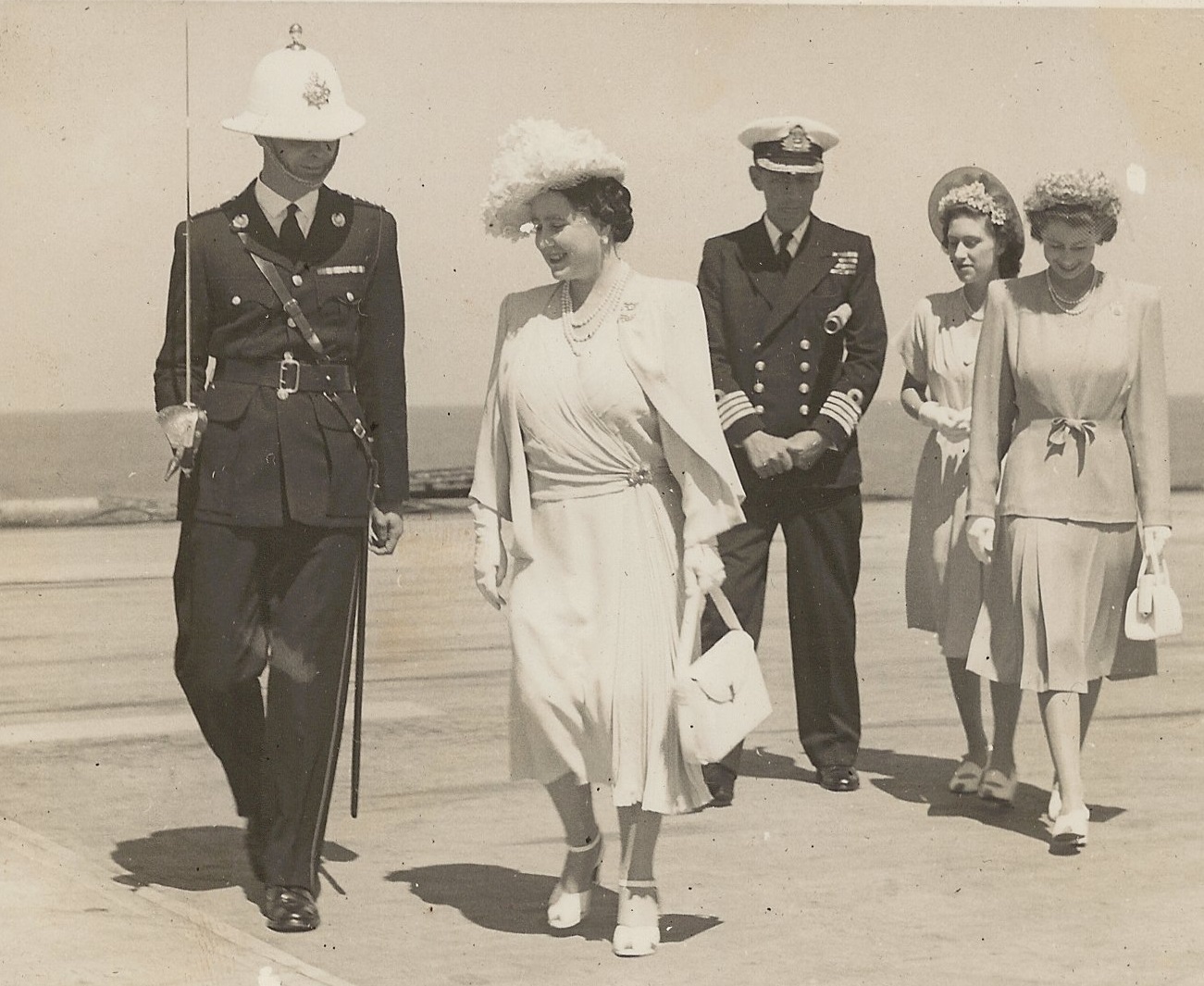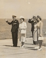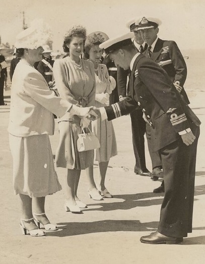 (JQ04) Her Majesty Queen Elizabeth is piped aboard HMS TRIUMPH (JQ05) Princesses Elizabeth and Margaret are piped aboard HMS TRIUMPH (JQ06) The CO of HMS TRIUMPH with Her Majesty Queen Elizabeth, Princesses Margaret and Elizabeth (JQ07) Unidentified offer on HMS TRIUMPH greeting Her Majesty Queen Elizabeth (JQ08) Royal Marine Guard walking alongside Queen Elizabeth; the CO of HMS TRIUMPH walking beside Princesses Elizabeth and Margaret