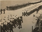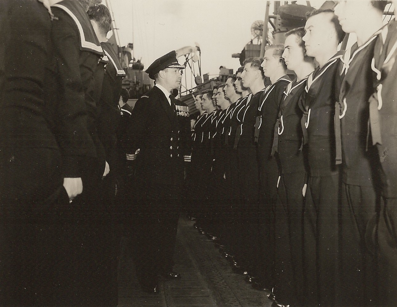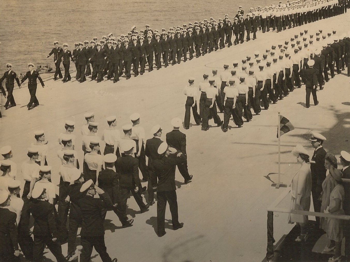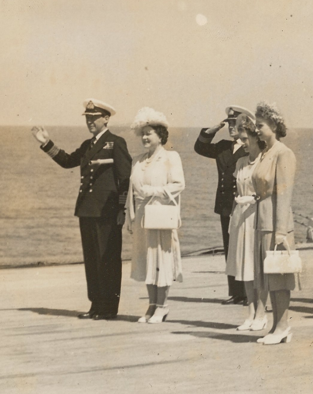 (JQ09) Queen Elizabeth, Princesses Elizabeth and Margaret inspect the ship's company of HMCS TRIUMPH. The Battleship HMS VANGUARD in the background (JQ10) Queen Elizabeth is reviewing officer for the march past of the ship's company of HMS TRIUMPH. Princesses Elizabeth and Margaret on the reviewing stand behind the Queen (JQ11) Crew of HMS VANGUARD manning the side for sail past with HMS TRIUMPH. Note the size of the 15-inch gun turrets compared to the sailors on deck.