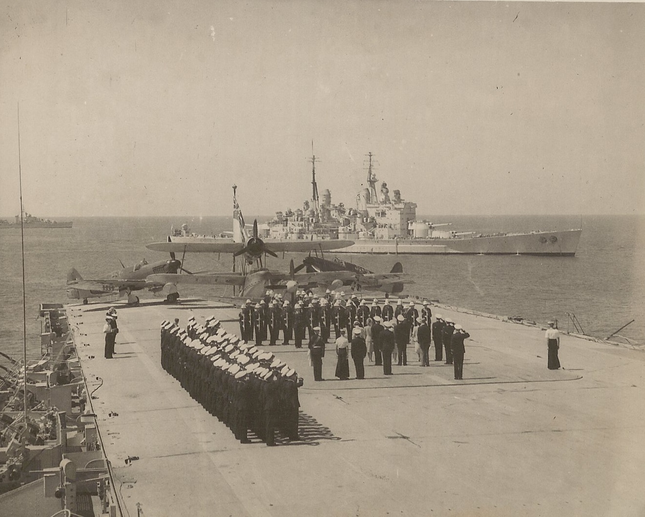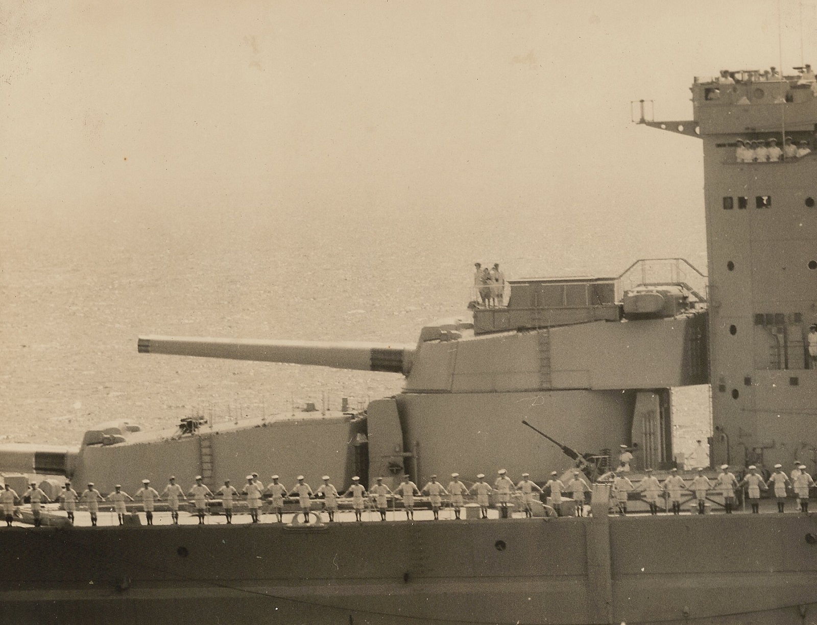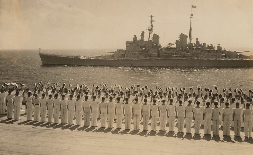 (JQ12) Royal Visit complete, the crew of HMS TRIUMPH salute the Royal Family aboard HMS VANGUARD as the ships part ways. Note the Royal Standard being flown atop the after mast of HMS VANGUARD