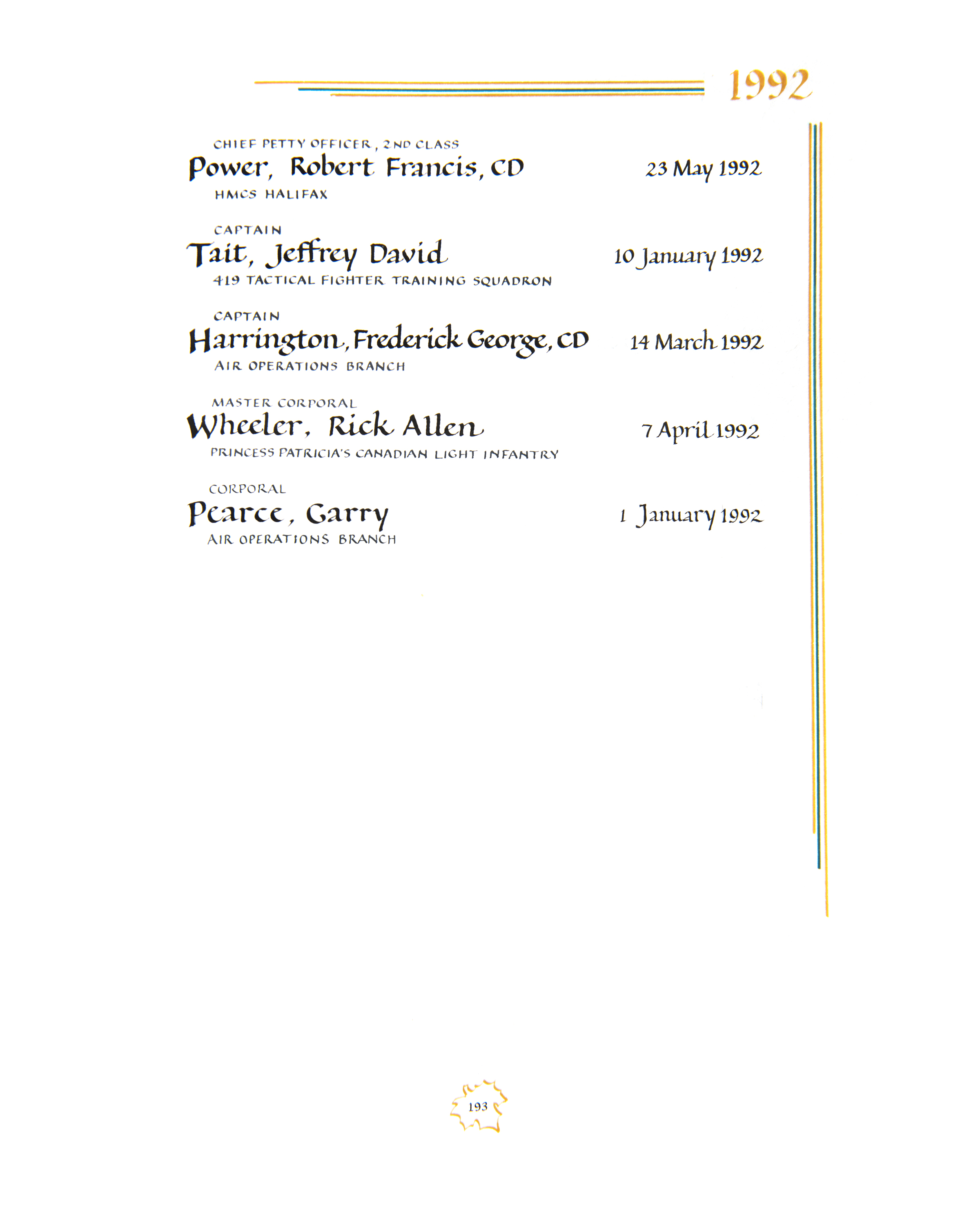 POWER, Robert Francis, CD, CPO2, N24784601, died - 23 May 1992, HMCS HALIFAX - Son of Robert Francis and Corine Mary Power of St. John's, Newfoundland; husband of Carol Ann (nee Greening) Power and father of Devon Allister and Robert Wade Power of Dartmouth, Nova Scotia.