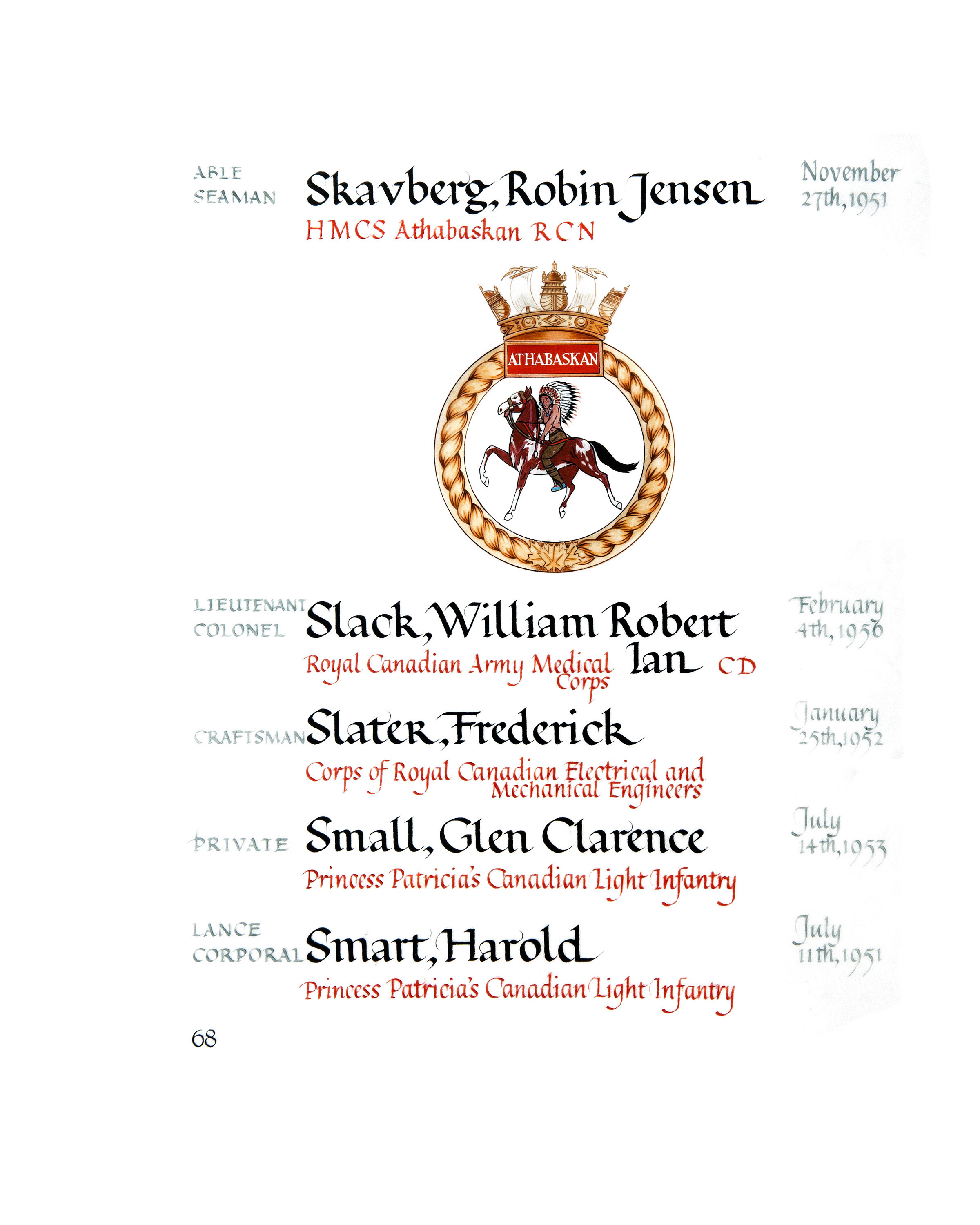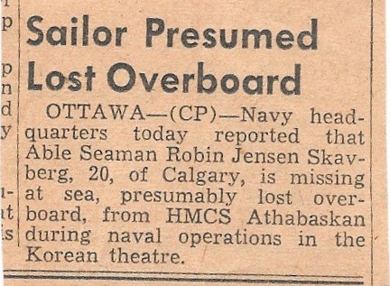 SKAVBERG, Robin Jensen, AB, 11021-E, RCN, MPK - 27 Nov 1951, HMCS ATHABASKAN - Son of Fredtjor and Jessie (nee Jensen) Skavberg of Calgary, AB. Brother of Fredtjof Eric Jensen Skavberg.