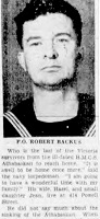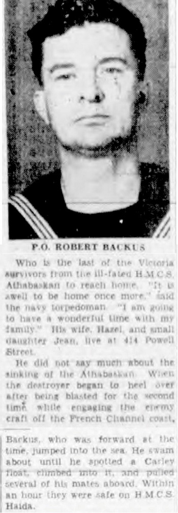 (...) Article on Robert Bacchus' arrival home after the sinking of HMCS ATHABASKAN G07