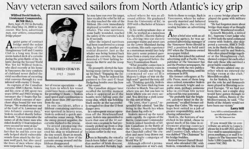 Article on LCdr Wilfred Stokvis from the Vancouver Sun 13 Jun 2000 Click on the above article to view a larger image
