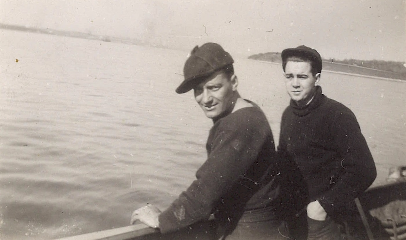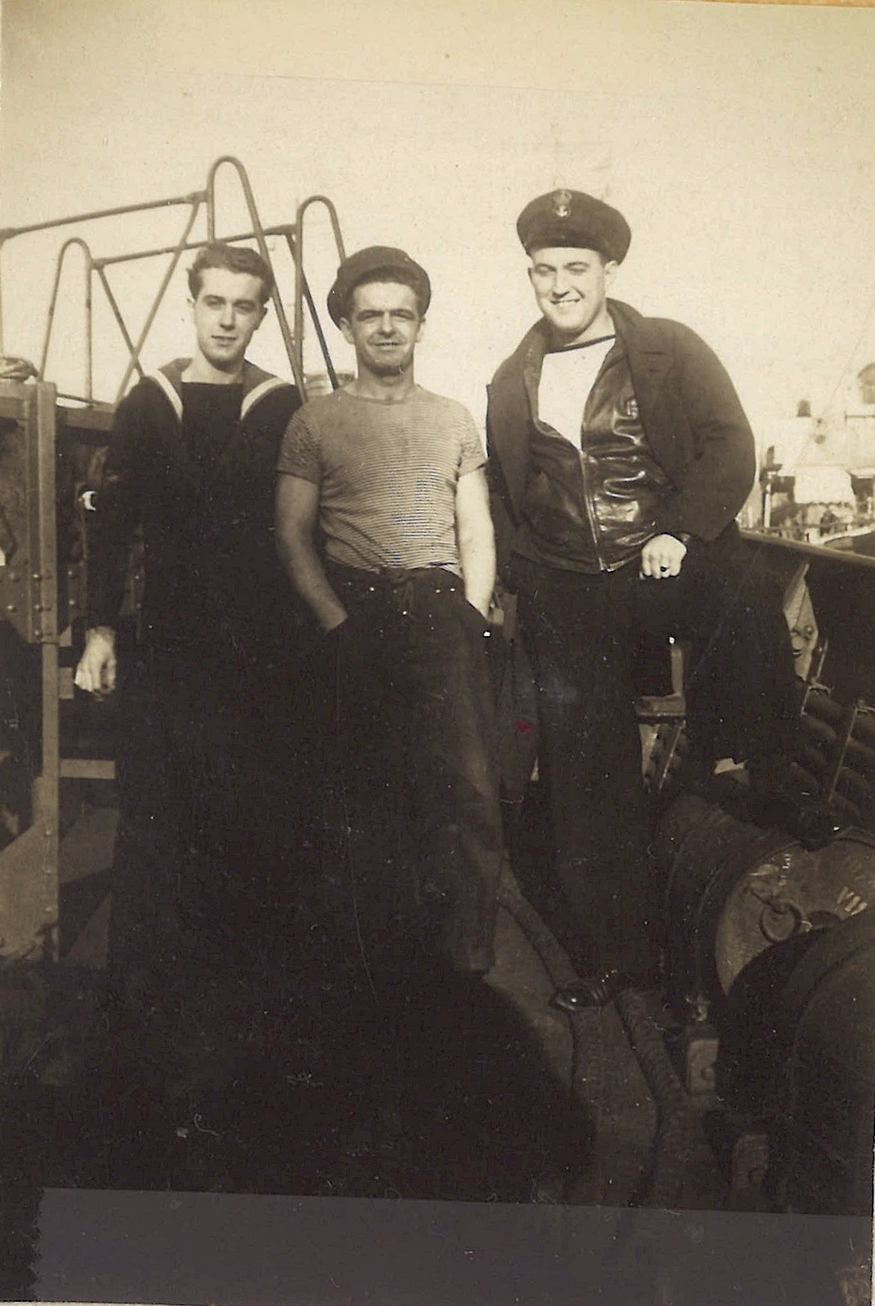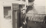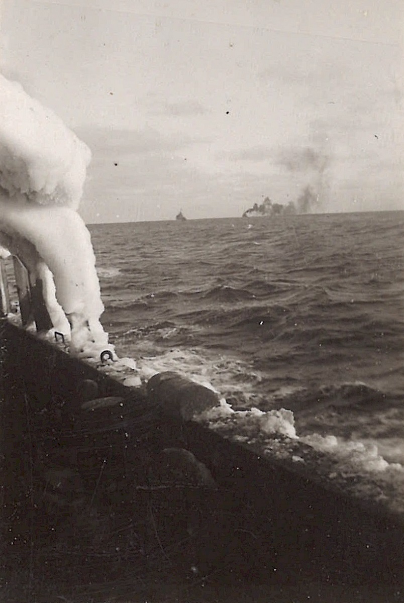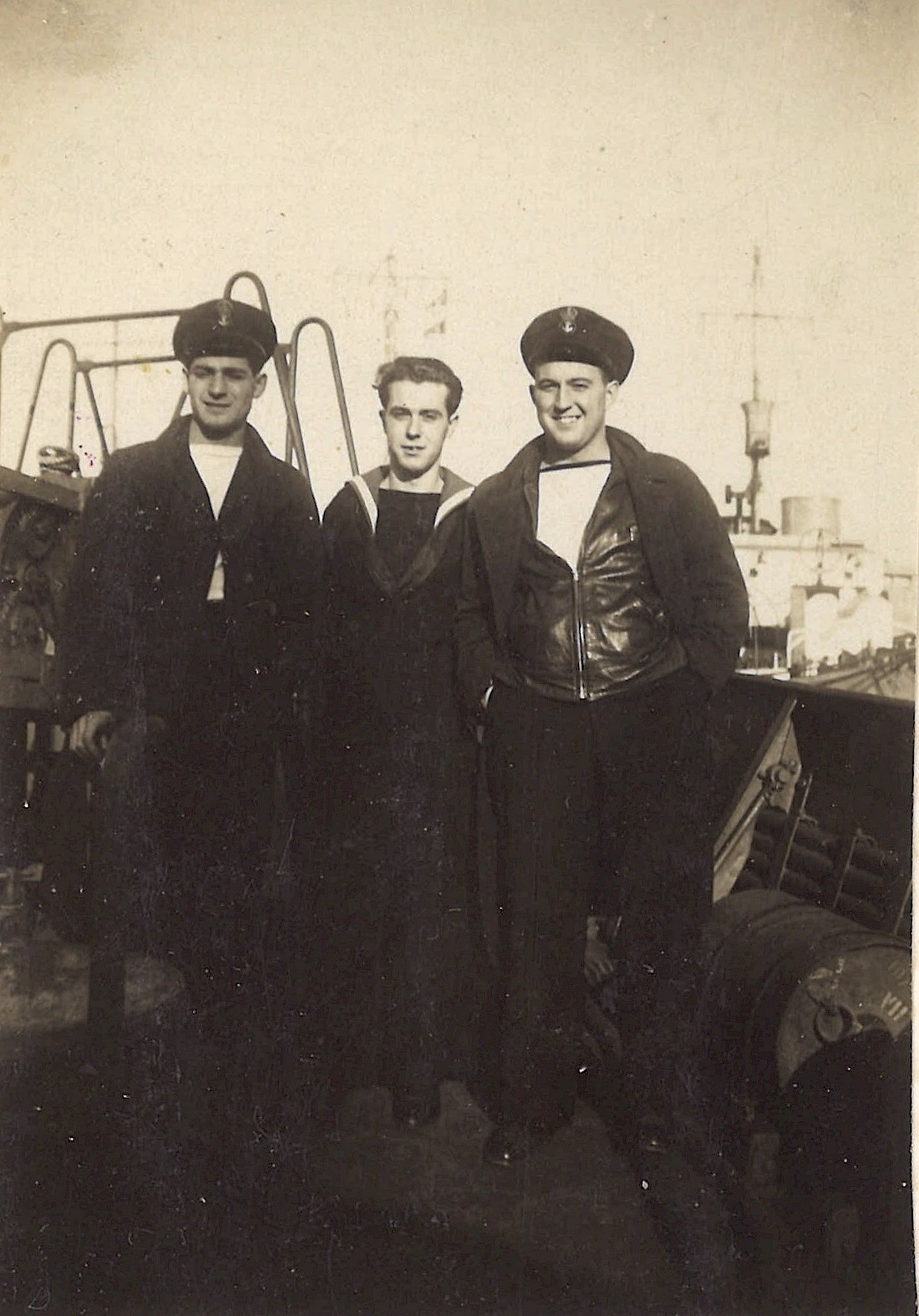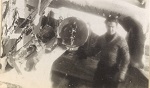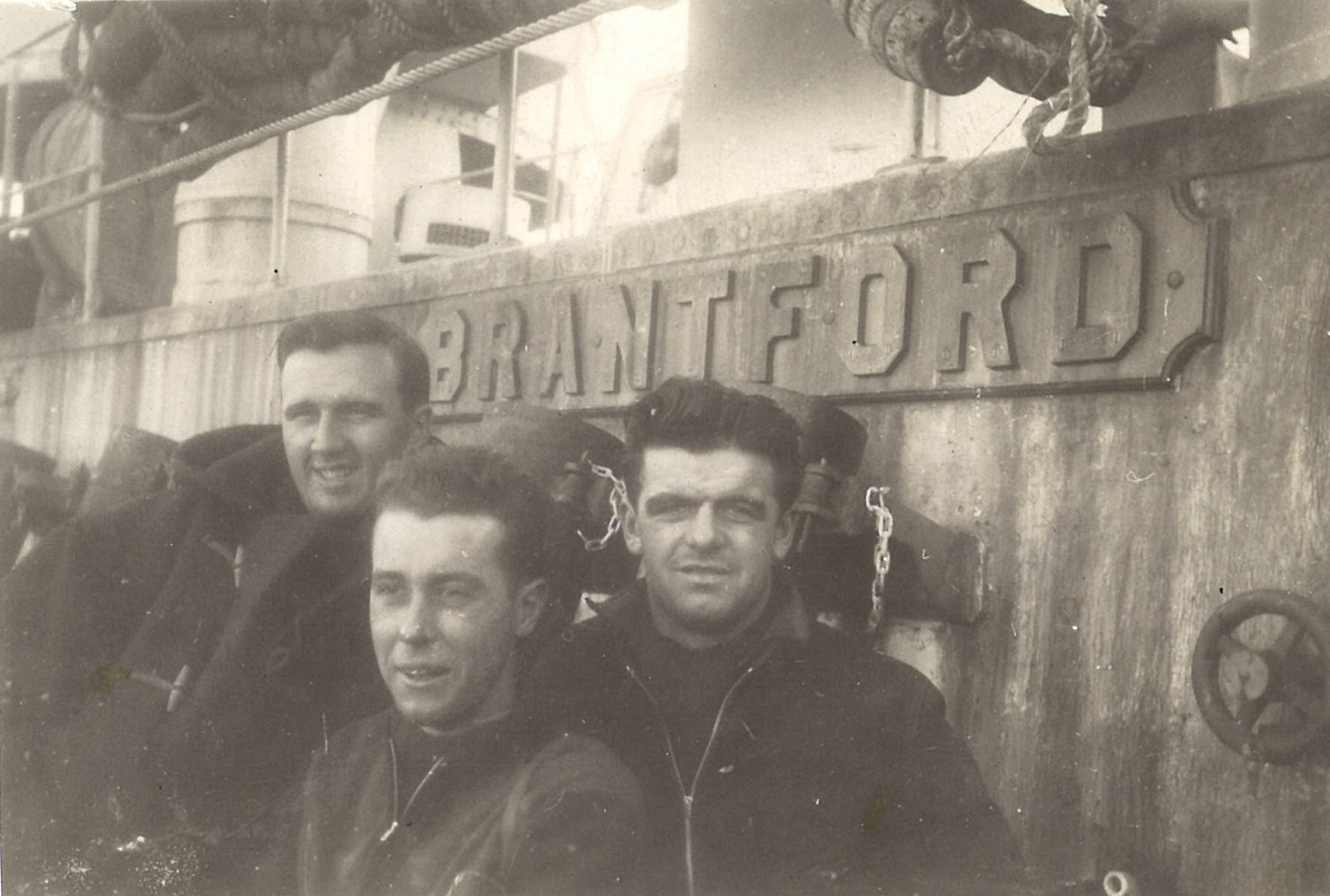 (WB06) "Doug visits Brantford" L-R: William Brown, Bryant, and Doug Brown (WB07) L-R: Unknown, William Brown and Doug Brown on HMCS BRANTFORD K218 (WB08) Engine room air intakes and bandstand (after gun platform) on HMCS BRANTFORD K218 (WB09) "Friendly I hope". Unidentified sailors on HMCS BRANTFORD K218 (WB10) HMCS BRANTFORD (foreground) iced-up. Unknown ship on horizon making smoke