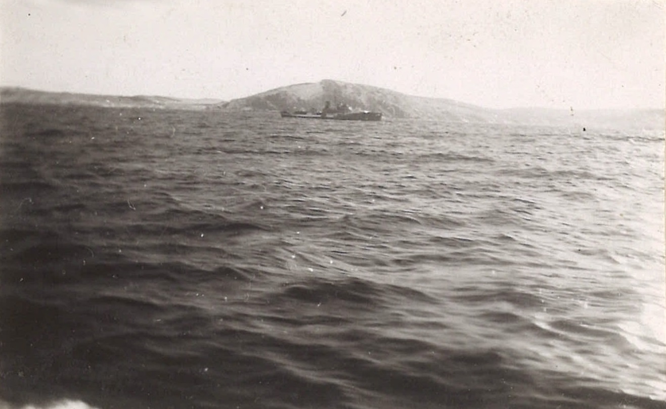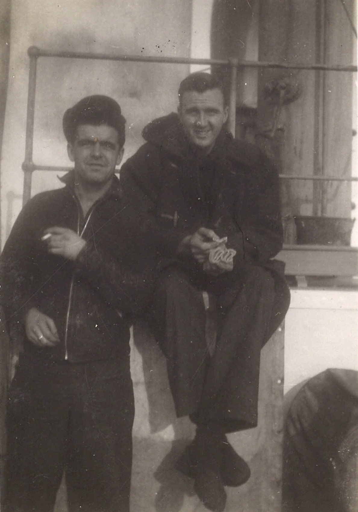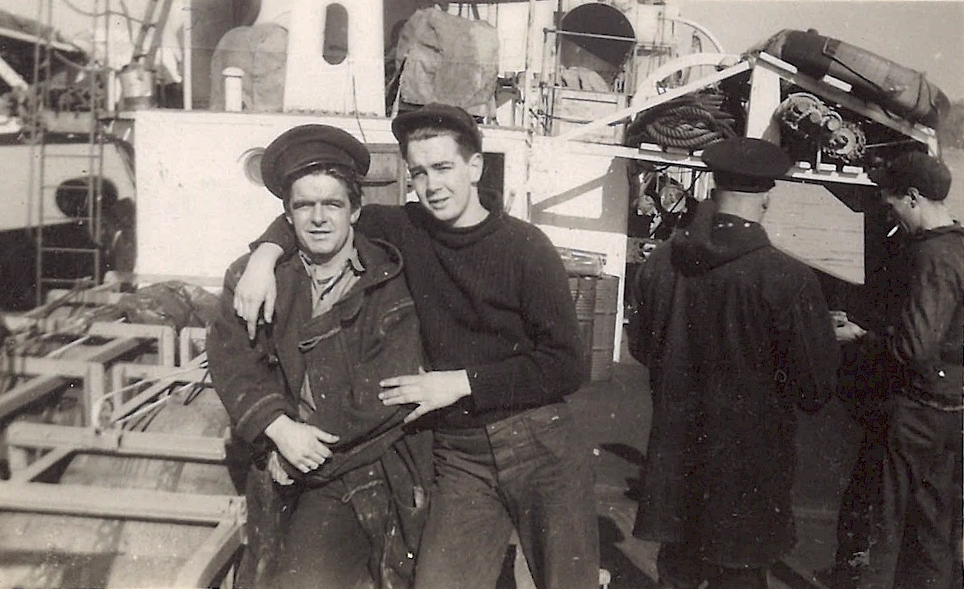 (WB41) Merchant ship, running high out of the water with no cargo, passed by HMCS BRANTFORD K218. Note the stern gun on the merchant ship (WB42) Unknown corvette (WB43) Bill Brooks (right) and unknown shipmate on HMCS BRANTFORD K218 (WB44) Unknown merchant ship (WB45) Merchant ships in convoy. Not the deck gun on the stern of the ship