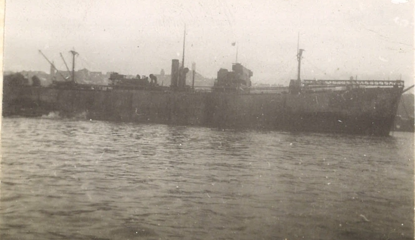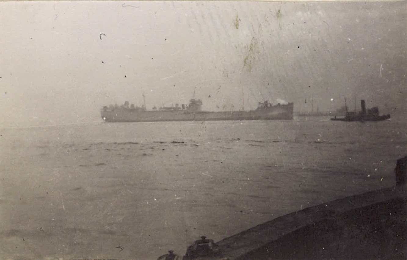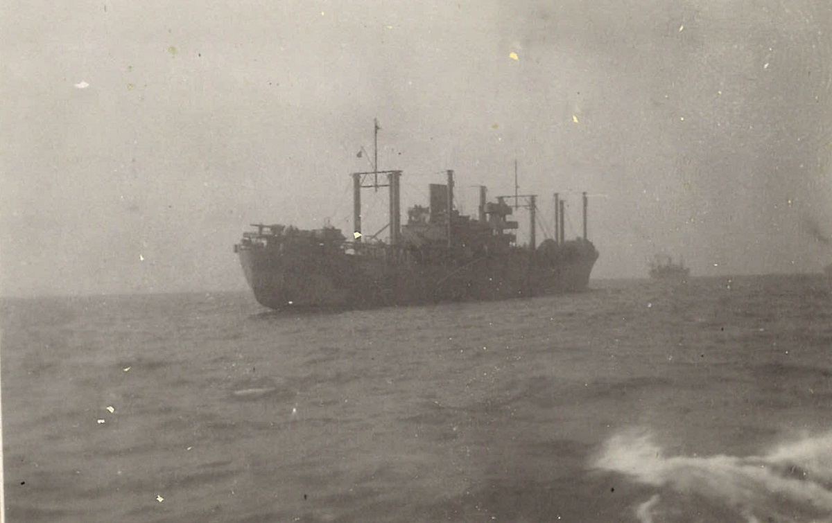 (WB41) Merchant ship, running high out of the water with no cargo, passed by HMCS BRANTFORD K218. Note the stern gun on the merchant ship (WB42) Unknown corvette (WB43) Bill Brooks (right) and unknown shipmate on HMCS BRANTFORD K218 (WB44) Unknown merchant ship (WB45) Merchant ships in convoy. Not the deck gun on the stern of the ship