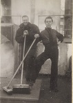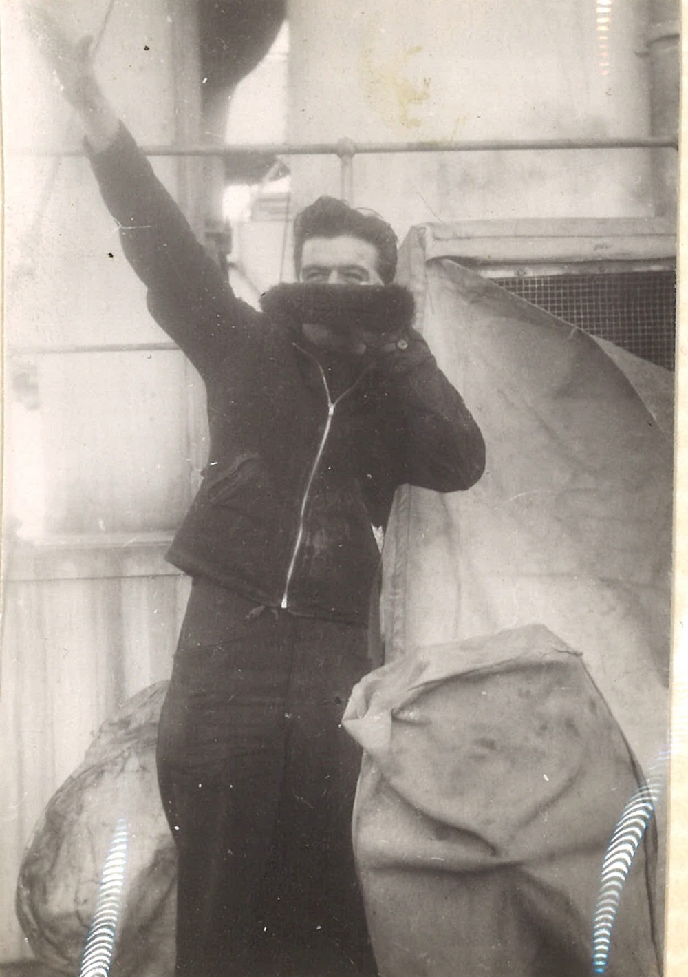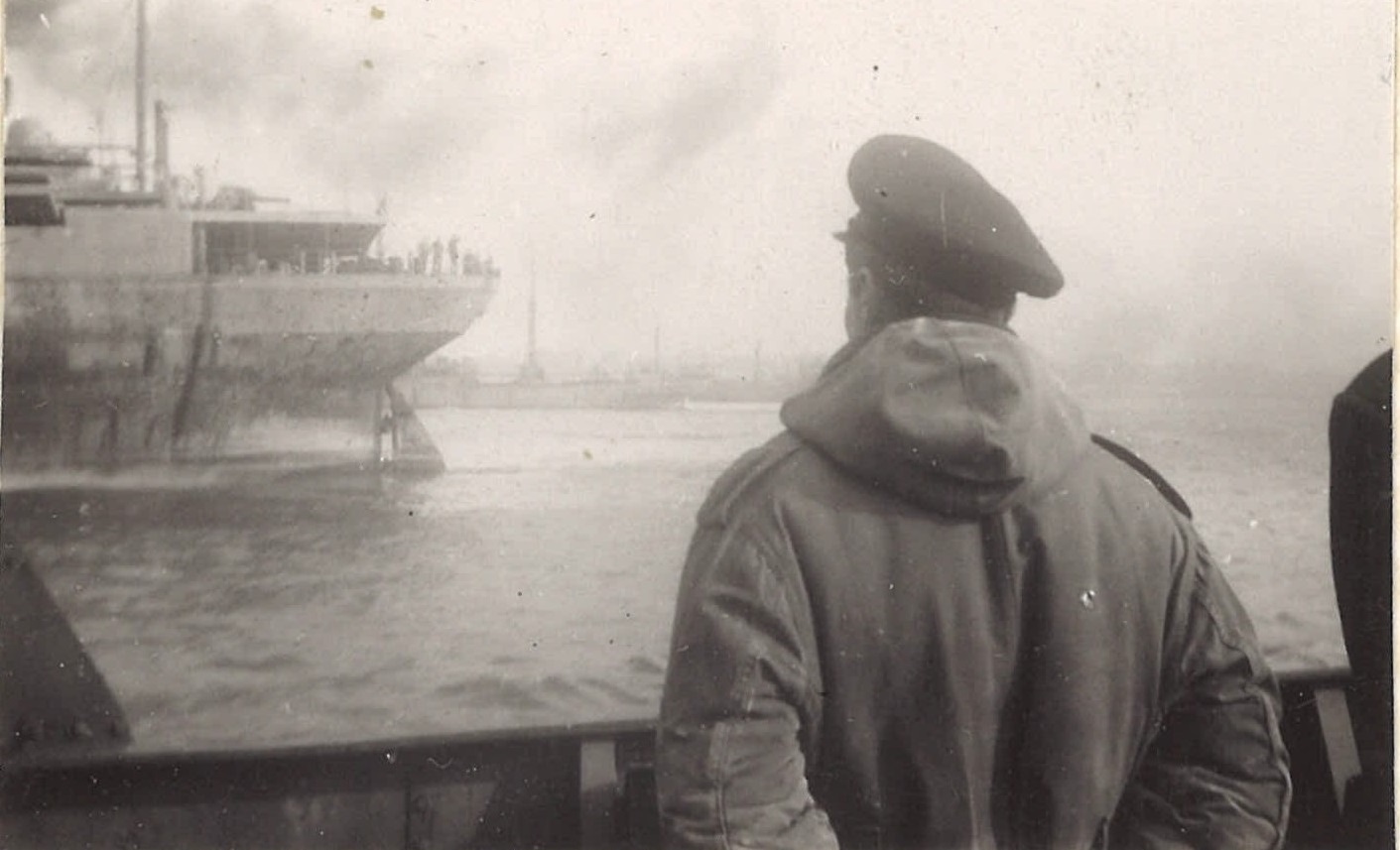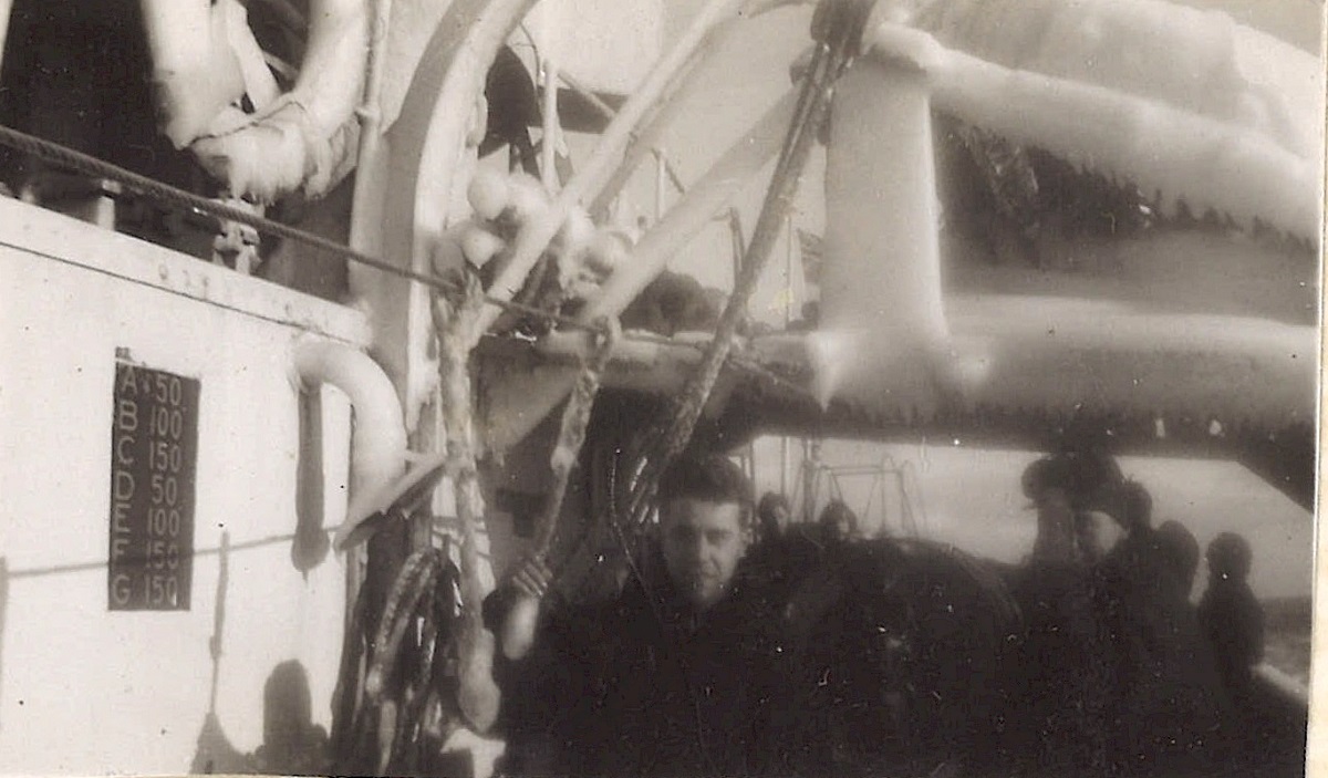 (WB16) Unknown merchant ships and tug (WB17) Unidentified sailor with chipping hammer on HMCS BRANTFORD K218 (WB18) unidentified sailors on HMCS BRANTFORD K218. Note the ice on the ship and one sailor holding a safety rope (WB19) William Brown on HMCS BRANTFORD K218 (WB20) Unidentified destroyer, possibly USN