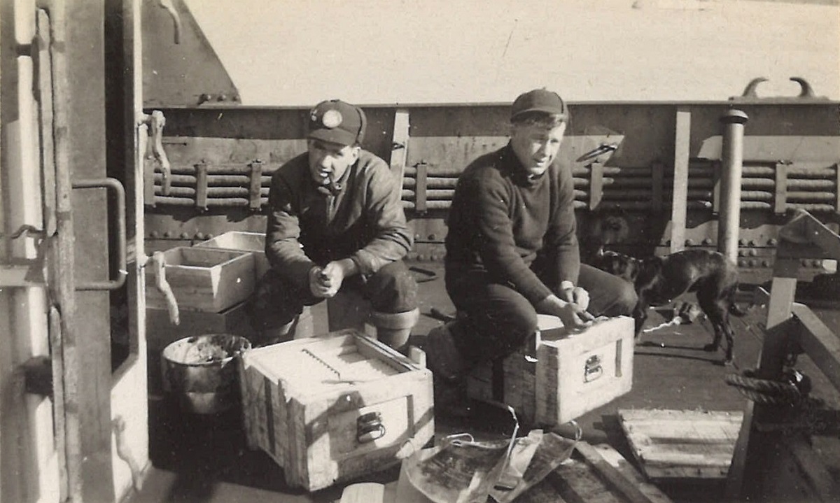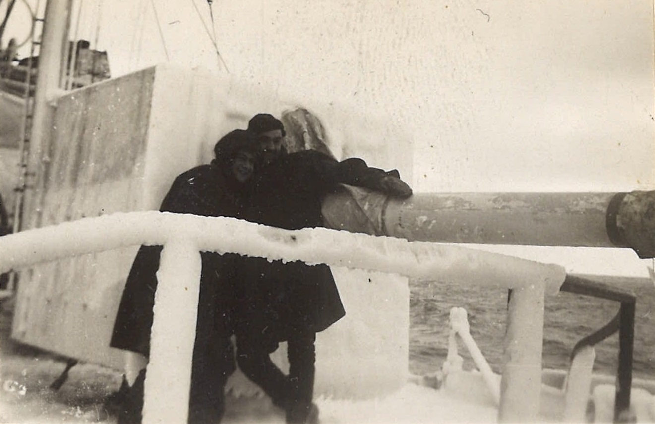 (WB01) Big Brownie (Doug Brown) (left), Little Brownie (William Donald Brown) (centre) and Bryant on HMCS BRANTFORD K218 (WB02) Unidentified sailors by the 4-inch gun on HMCS BRANTFORD K218 (WB03) "Spud" Island chipping ice on HMCS BRANTFORD K218 (WB04) Barber by the depth charge thrower on HMCS BRANTFORD K218 (WB05) Bryant (left) and Bill Brooks on HMCS BRANTFORD K218