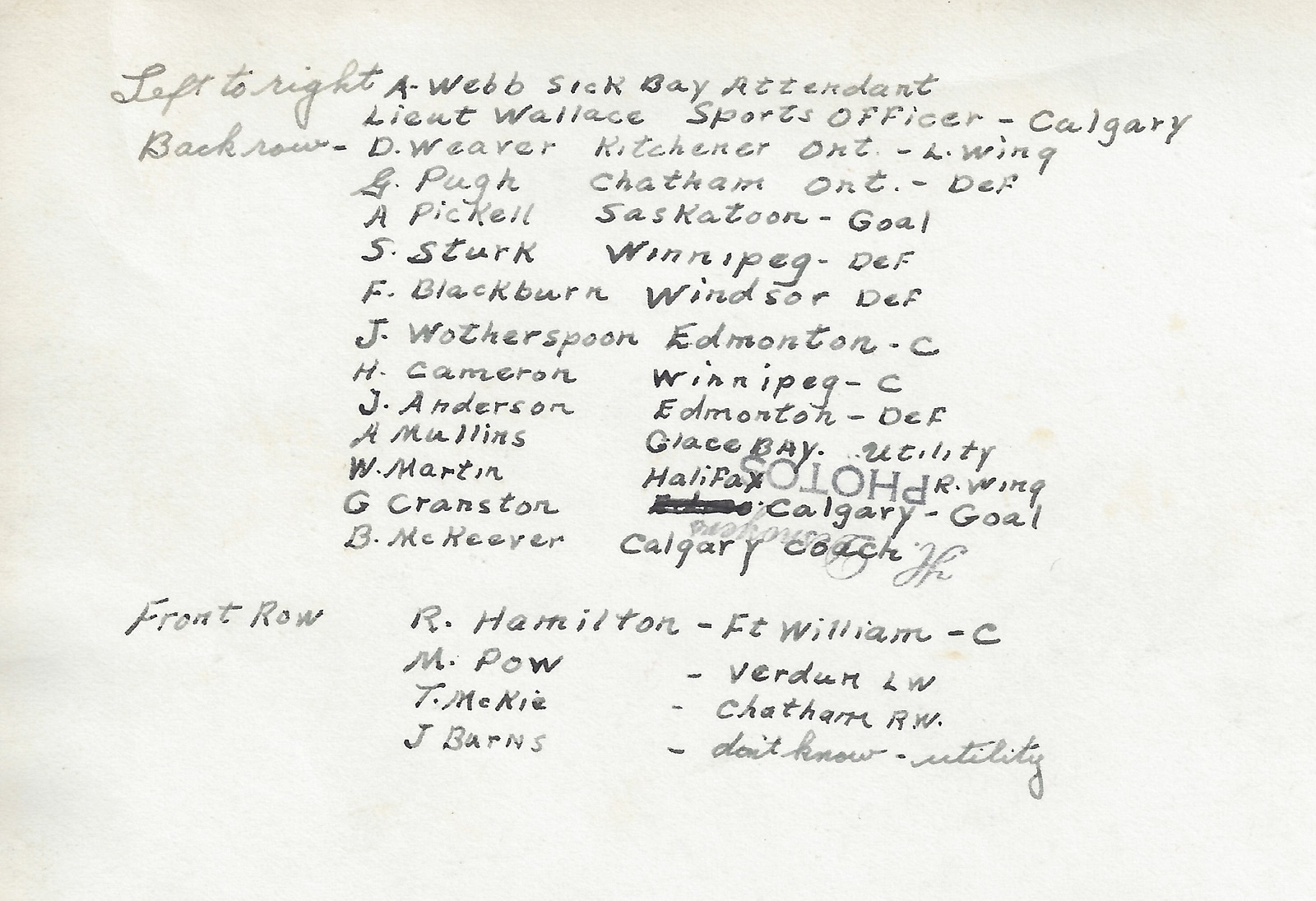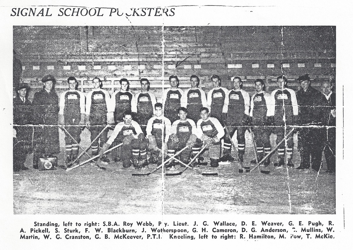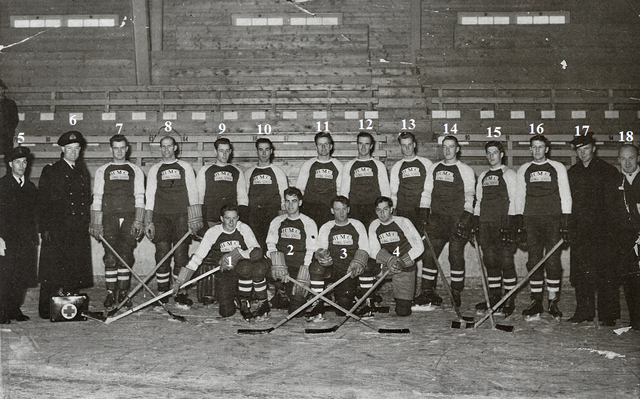 (1) Hamilton, R., Centre (of Fort William, ON (2) Pow, M., Left Wing, of Verdun, Quebec (3) McKie, T., Right Wing (of Chatham, ON) (4) Burns, J., Utility (5) Webb, Roy, SBA (6) Wallace, J.G., Pay-Lieut, Sports Officer (of Calgary, AB) (7) Weaver, D.E., Left Wing (of Kitchener, ON) (8) Pugh, G.E., Defence (of Chatham, ON) (9) Pickell, R.A., Goalie (of Saskatoon, SK) (10) Sturk, S., Defence (of Winnipeg, MB) (11) Blackburn, F.W.. Defence (of Windsor, ON) (12) Wotherspoon, J., Centre (of Edmonton, AB) (13) Cameron, G.H., Centre (of Winnipeg, MB) (14) Anderson, J., Defence (of Edmonton, AB) (15) Mullins, A., Utility (of Glace Bay, NS (16) Martin, W. (17) Granston, W.G., Goalie (of Calgary, AB) (18) McKeever, C.B., PTI, Coach (of Calgary, AB)