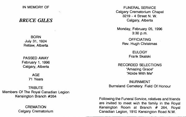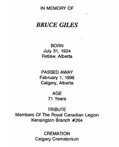 GILES, Bruce - passed away on February 1, 1996 at the age of 71 years. He is survived by his wife Winnifred; sons, Wayne (Penny) and Douglas; daughters, Jean, Karen (Frank) and Kathleen (Carl); four grandchildren and three great-grandchildren; and one brother Glen (Marion). He was predeceased by his parents, Annie and Elmer, his brother Lawrence and sister Evelyn. Bruce was a decorated veteran of the Royal Canadian Navy in World War II. Funeral Services will be held at the Calgary Crematorium Chapel, 3219 - 4 Street N.W. (inside Queen's Park Cemetery), on Monday, February 5, 1996 at 3:30 p.m. with Rev. Hugh Christmas officiating. Arrangements and Cremation in care of Heritage Family Funeral Services. Telephone: 299-0111