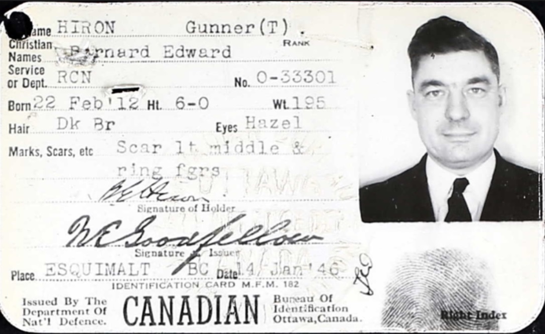 B.E. Hiron enlisted in the RCN on 05 Feb 1931 and had attained the rank of A/CPO, TGM (Torpedo Gunner's Mate) before commissioning from the ranks and being promoted to Warrant on 31 Jul 1945.