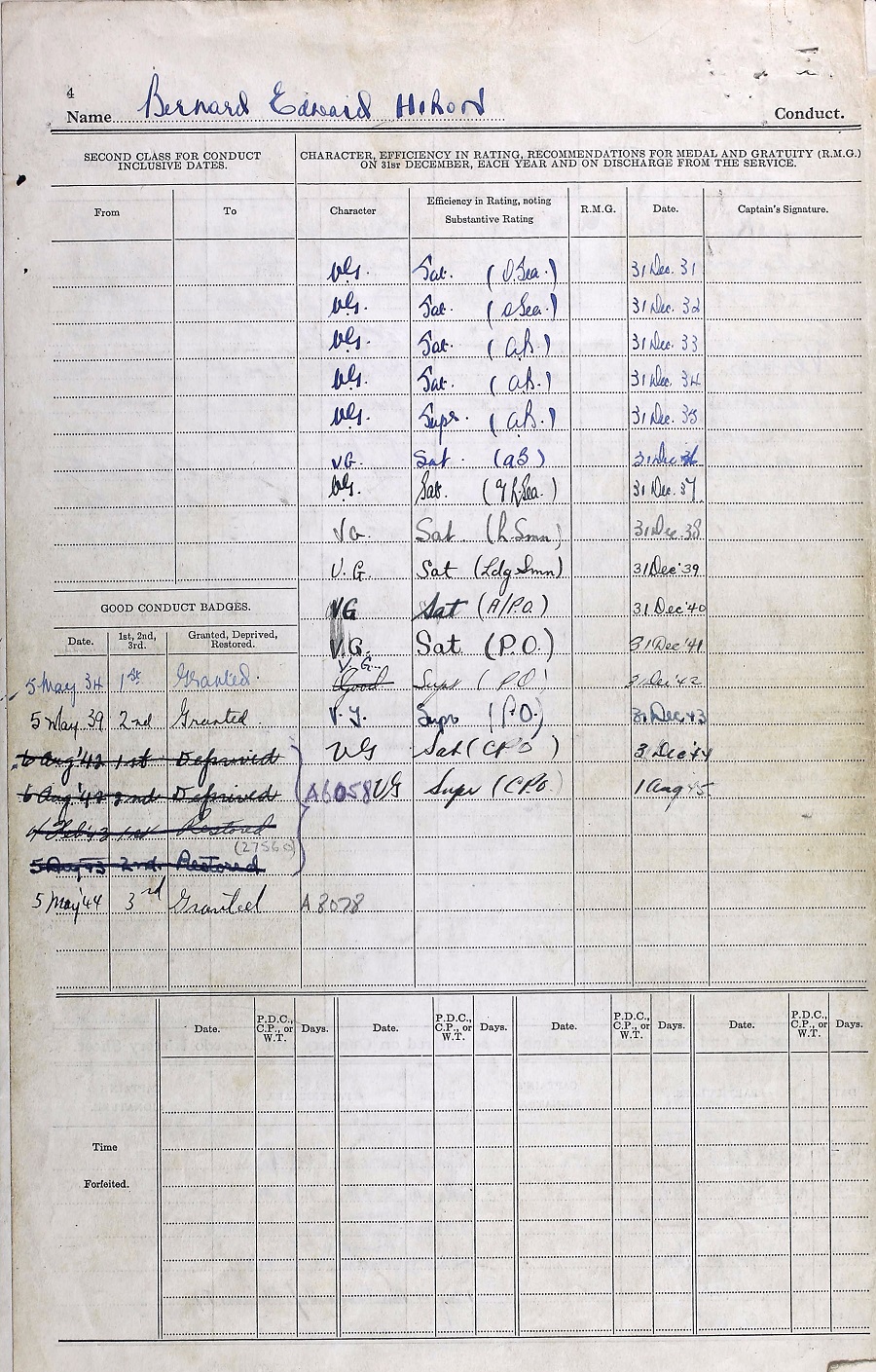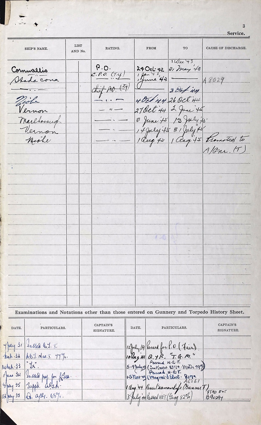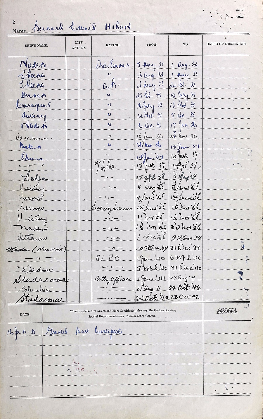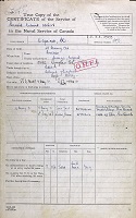Ships served in: HMCS SKEENA - Served in Skeena 02 Aug 1932 - 24 Feb 1933 as an OS and AB, RCN HMS COURAGEOUS - Served in Courageous 16 Jul 1935 - 13 Nov 1935 as an AB, RCN HMCS VANCOUVER - Served in Vancouver 18 Jan 1936 - 25 Nov 1936 as an AB, RCN HMCS SKEENA - Served in Skeena 14 Jan 1937 - 05 May 1938 as an AB and A/LS, RCN HMCS OTTAWA - Served in Ottawa 01 Dec 1938 - 09 Nov 1939 as a LS, RCN HMCS NOOTKA - Served in Nootka 10 Nov 1939 - 06 Mar 1940 as a LS and A/PO, RCN HMCS COMOX - Lent to Comox from Nootka - 29 Feb 1940 - 05 Mar 1940 HMCS COLUMBIA - Served in Columbia 24 Aug 1941 - 21 Oct 1942
