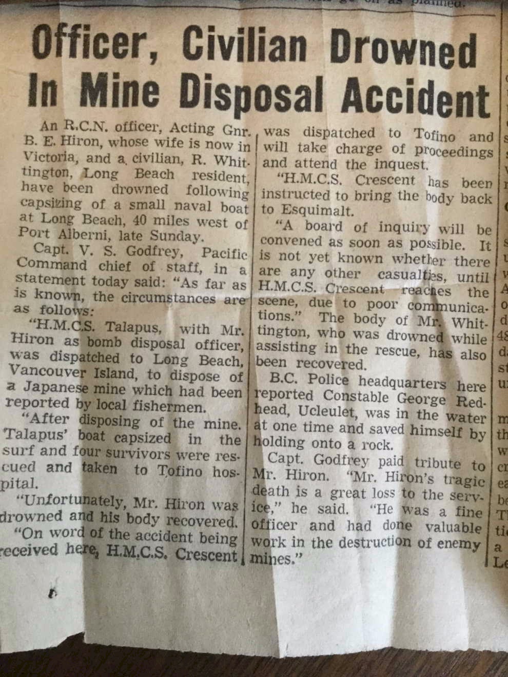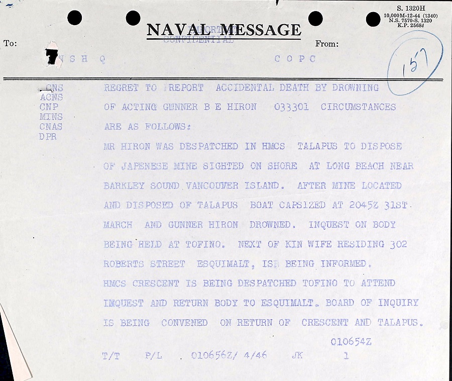 A/Gunner (T) Hiron drowned after a small boat from HMCS TALAPUS capsized at Long Beach near Barkley Sound, Vancouver Island, BC on 31 Mar 1946. A/Gunner (T) Hiron was dispatched in HMCS TALAPUS to dispose of a Japanese mine that had washed up on shore. After the mine was disposed of, the small boat from HMCS TALAPUS capsized and Mr. Hiron was drowned. His body was retrieved and transferred to HMCS CRESCENT for passage to Esquimalt. He is buried in the Veterans' Cemetery, Esquimalt, BC.