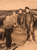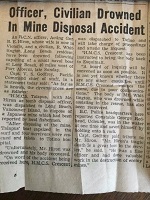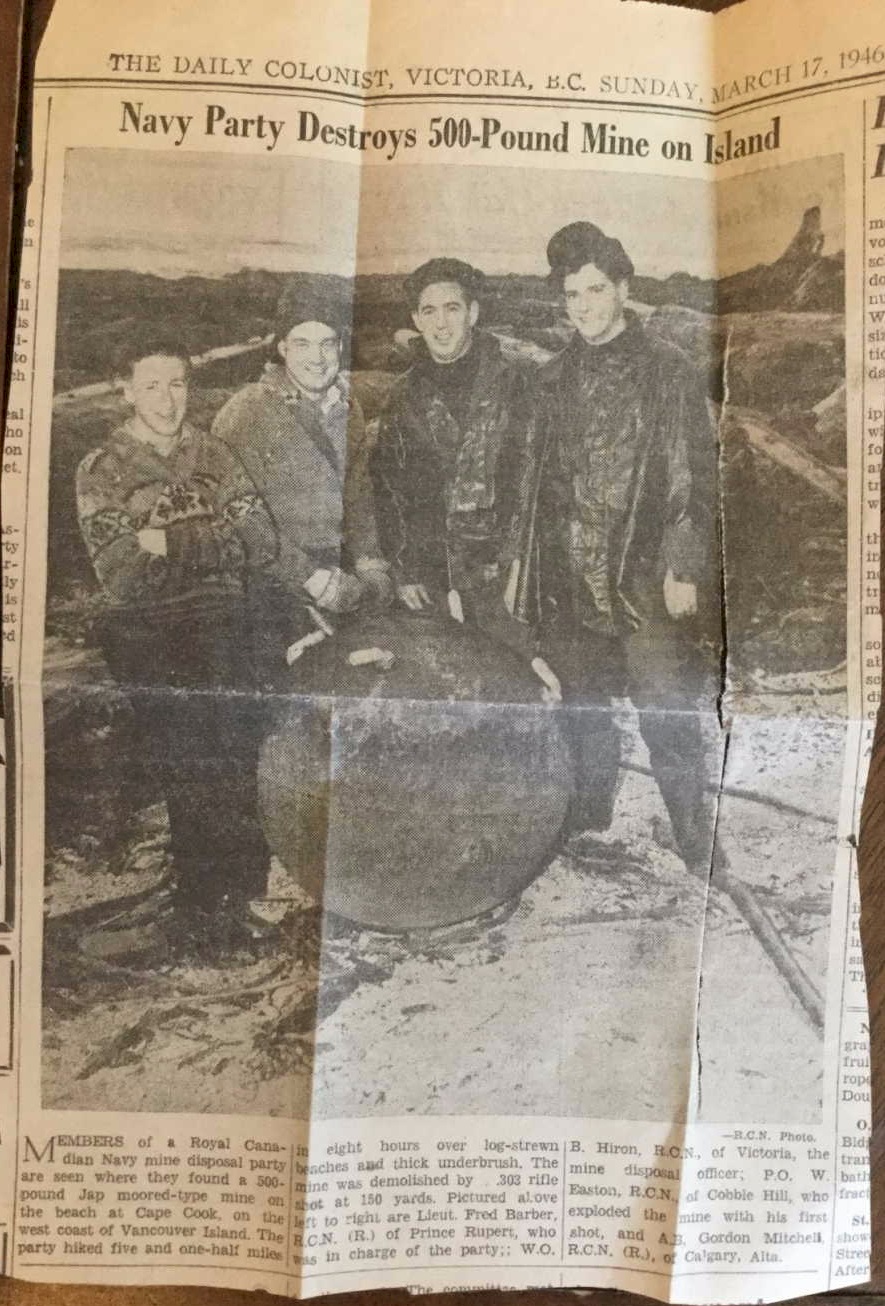 (BH01) Seaman Hiron (BH02) Petty Officer Hiron (BH03) ID card for A/Gunner (T) Hiron (BH04-BH05) Newspaper article (dated 17 Mar 1946) and accompanying photo of RCN mine-disposal team destroying 500lb Japanese mine at Cape Cook on west Vancouver Island (BH05) Mine disposal team, L-R: Lt Fred Barber, RCN(R), Officer in charge of mine disposal team; WO B.E. Hiron, RCN, Mine Disposal Officer, PO W. Easton, RCN and AB Gordon Mitchell, RCN(R)