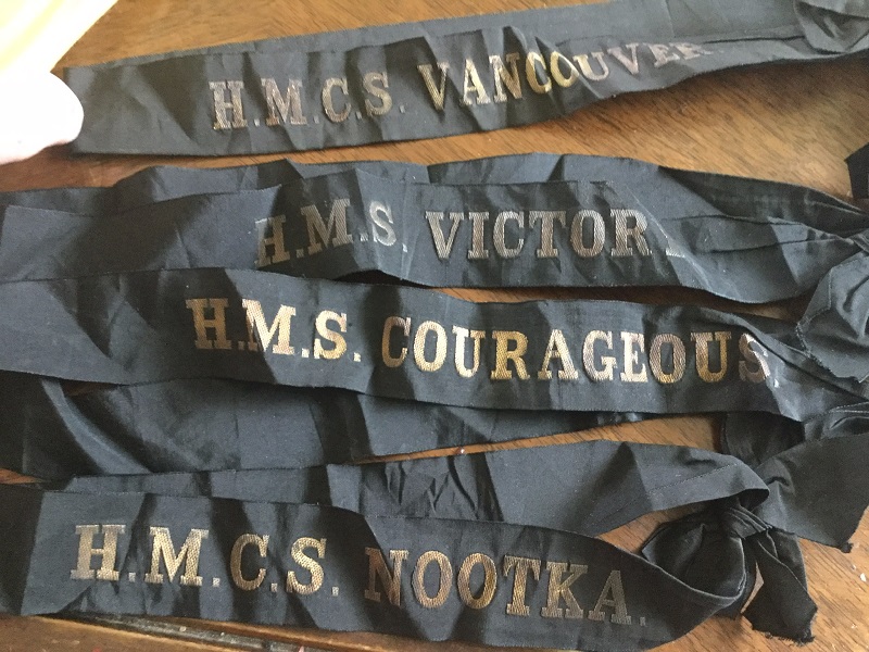 (BH06-BH09) Certificate of Service for Bernard Hiron (as a rating) (BH10) Bernard Hiron's cap tallies from the ships he served in