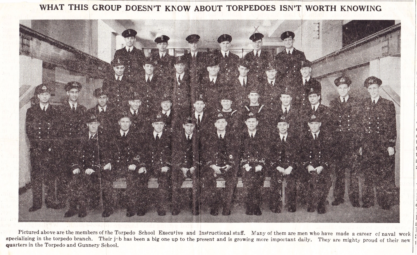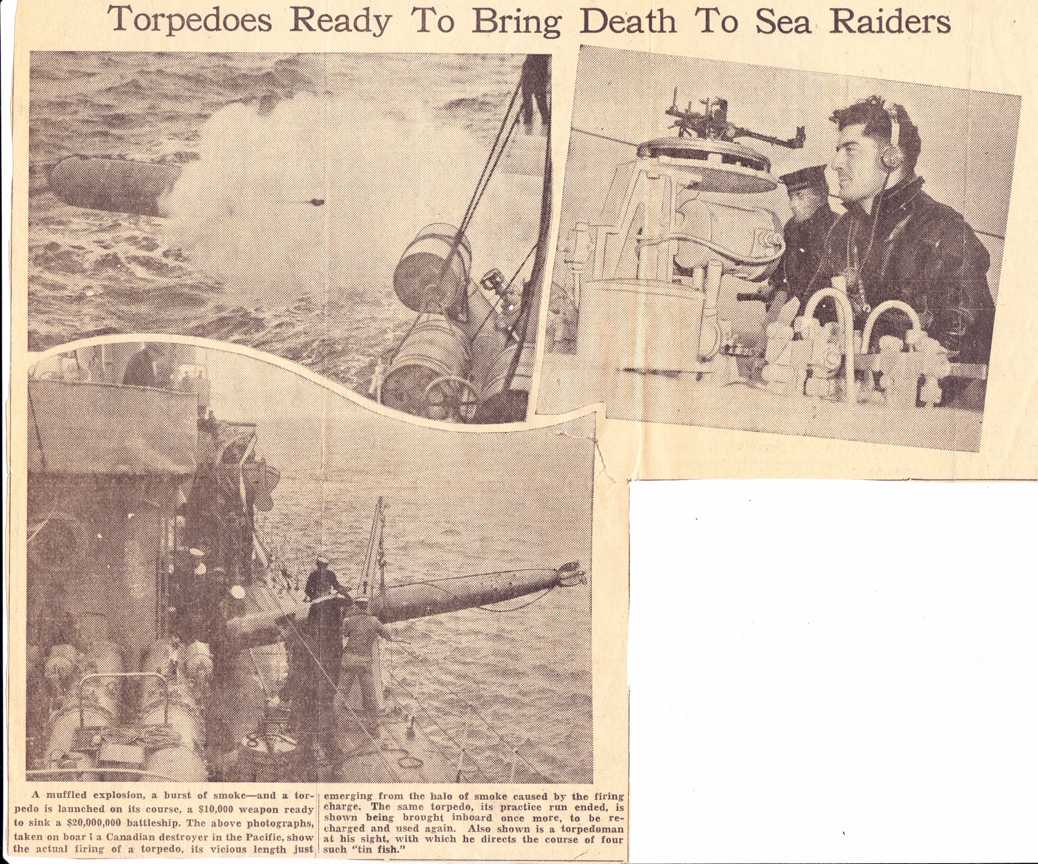 (BH15) Newspaper article on torpedo firing exercise. Bernard Hiron in top left photo, front (BH16) HMCS SKEENA at Stewart, BC - 07 Aug 1933 (BH17) Torpedo School Executive and Instructional Staff (BH18) HMS COURAGEOUS - Jul 1935